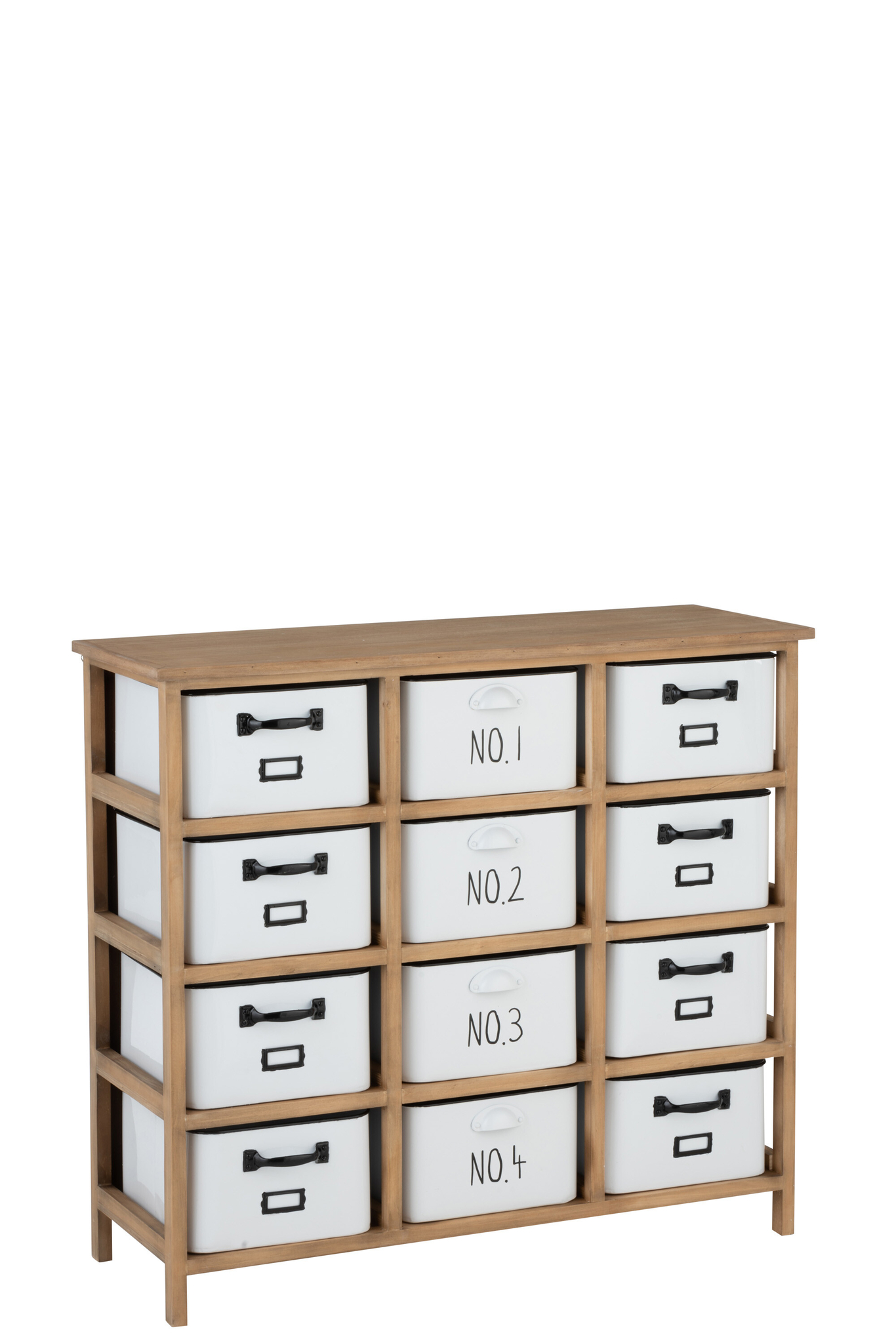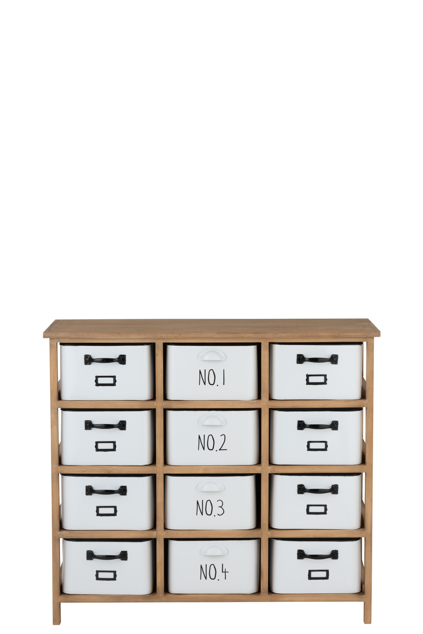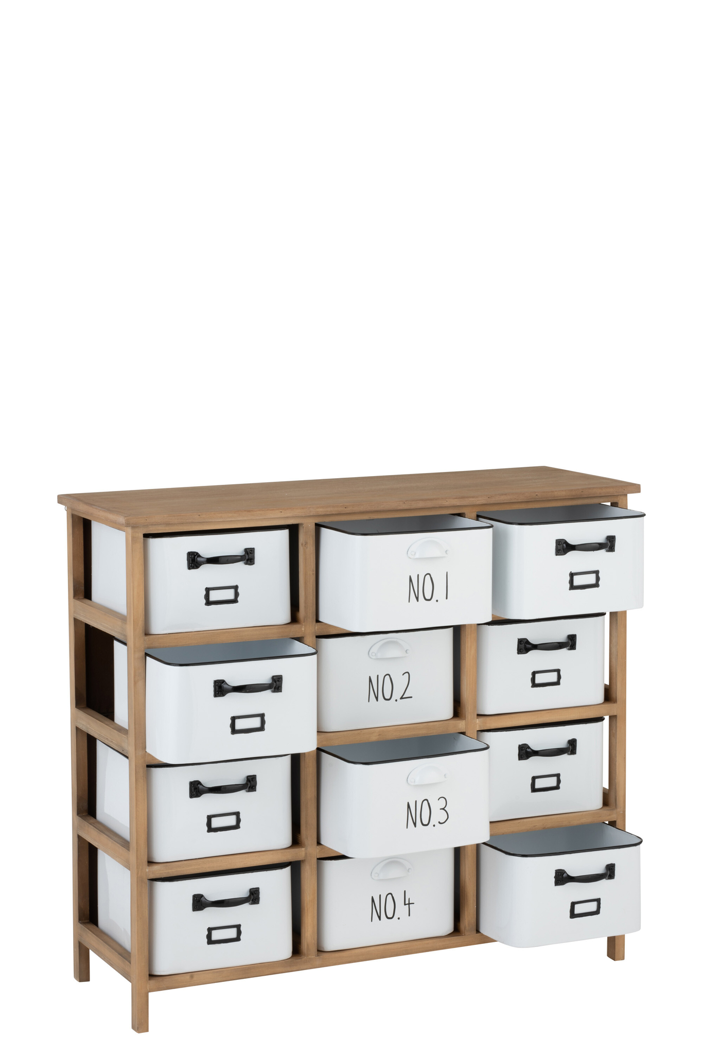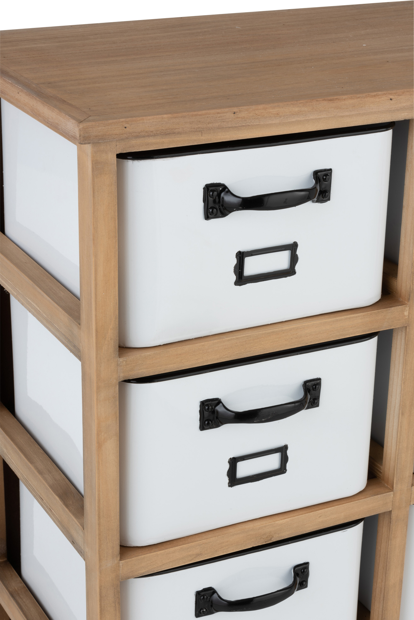 12-schubladiger Schrank aus Holz und Metall in Weiß/Schwarz/Natur mit viel Stauraum.