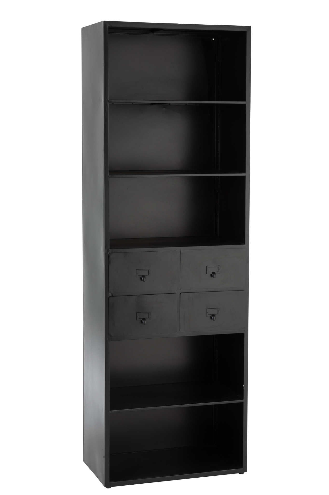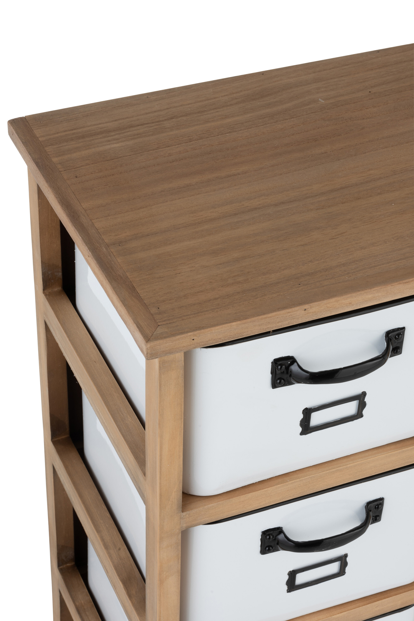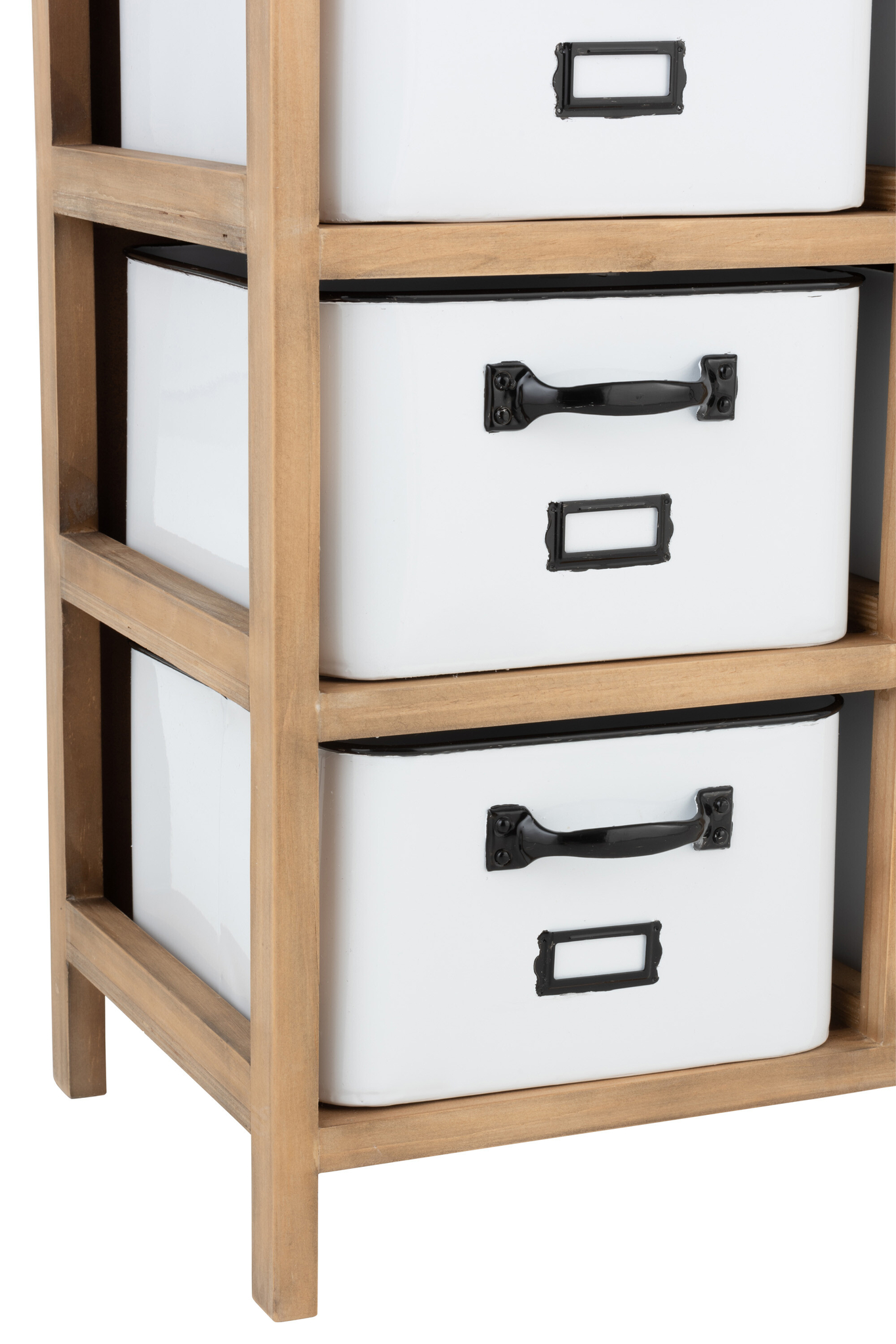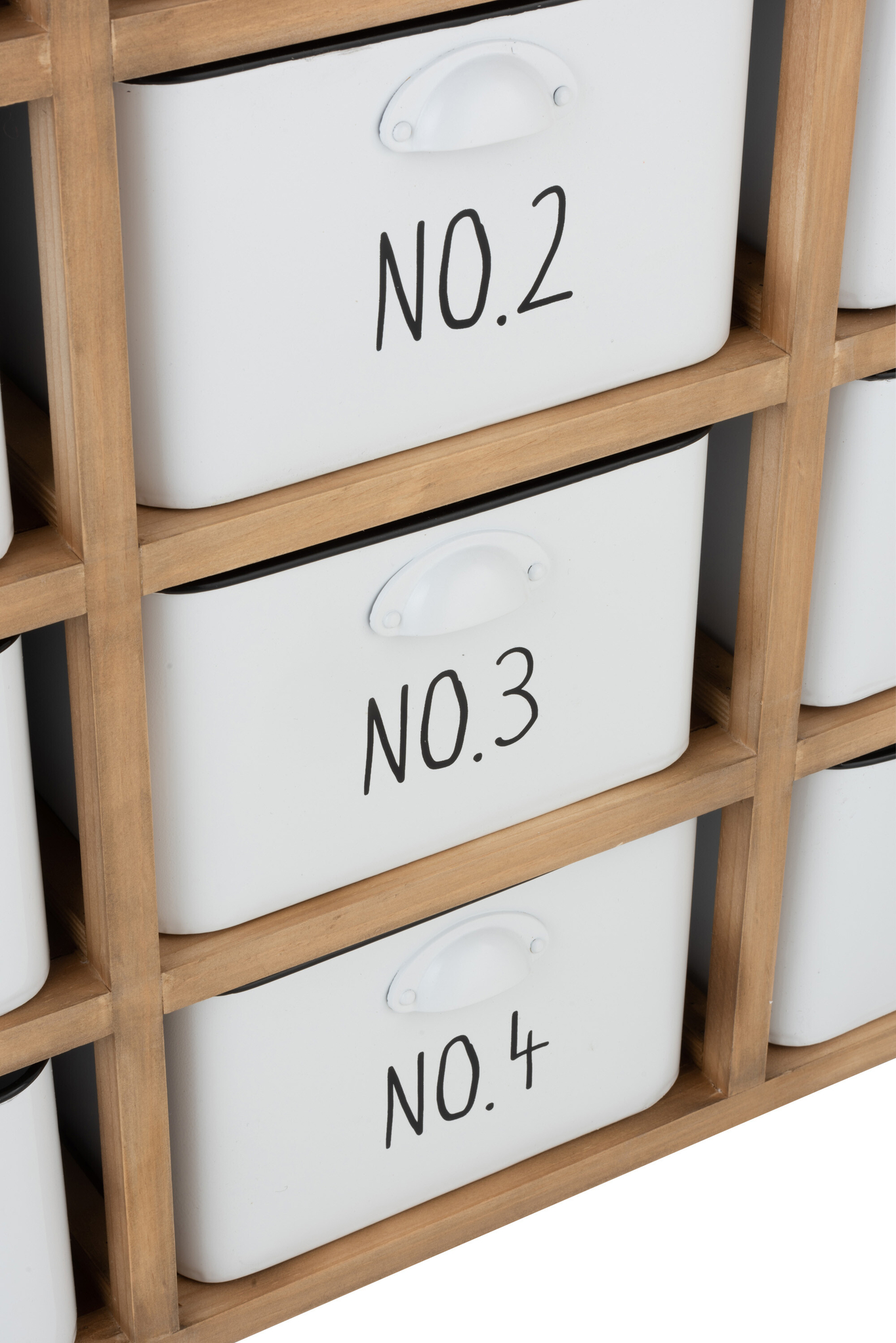 12-schubladiger Schrank aus Holz und Metall in Weiß/Schwarz/Natur mit viel Stauraum.