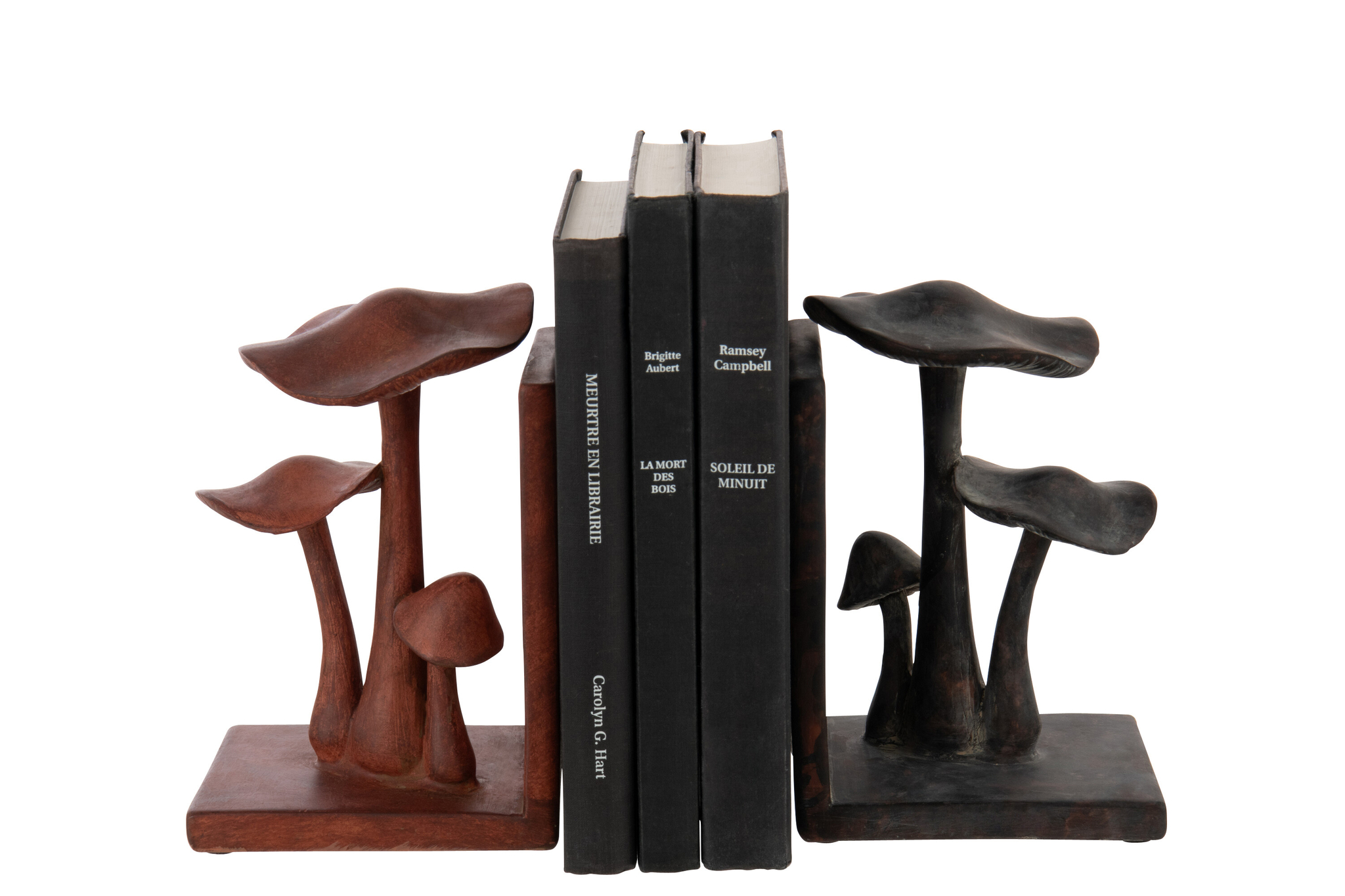 Zwei Buchstützen in Pilzform aus Polyresin, elegant, robust und ideal für dekorative Bücherpräsentation.