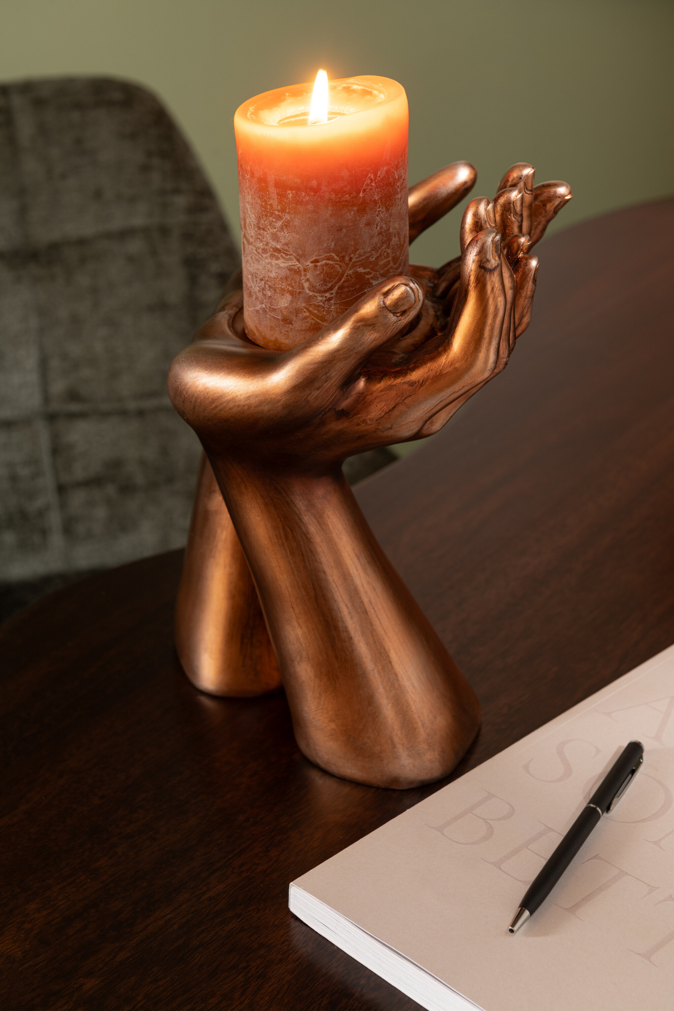 Dekorativer Kerzenhalter in Kupferoptik aus Resin und Kalkpulver für stilvolle Wohnakzente.