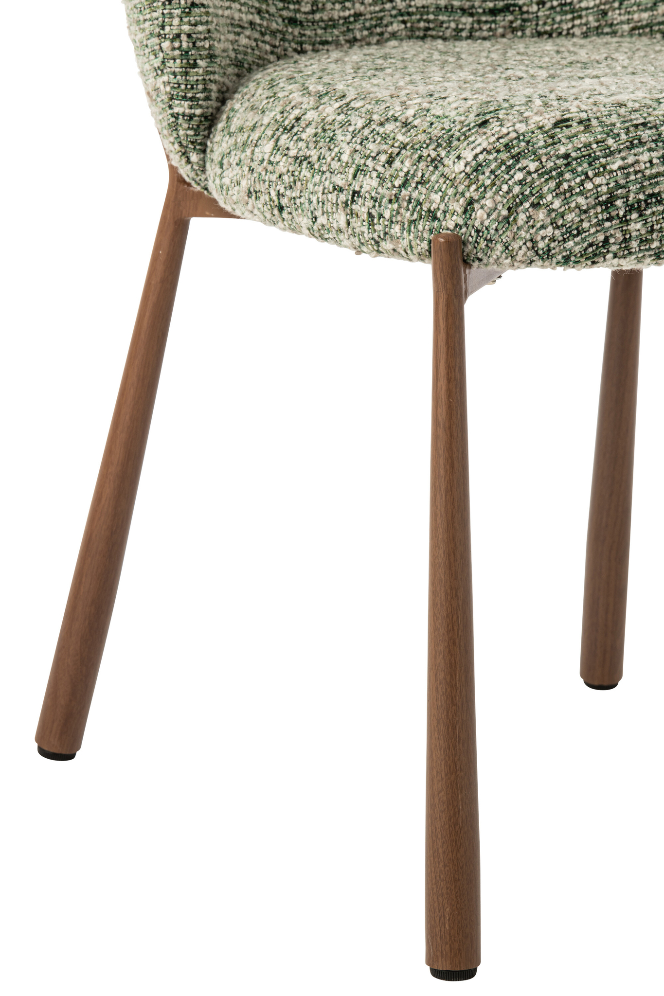 Moderner Esszimmerstuhl in Olivgrün mit Metallgestell und komfortabler Polsterung.