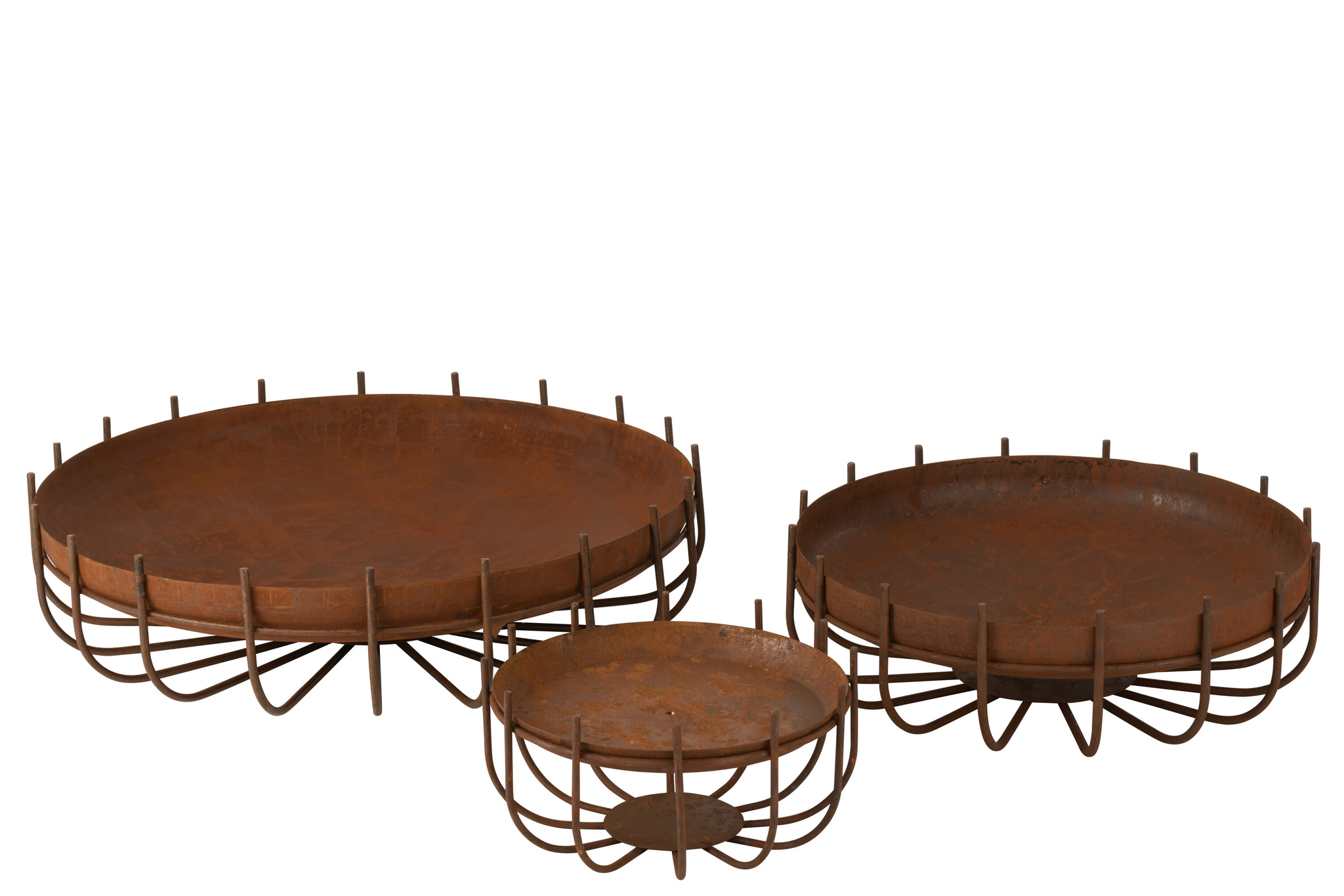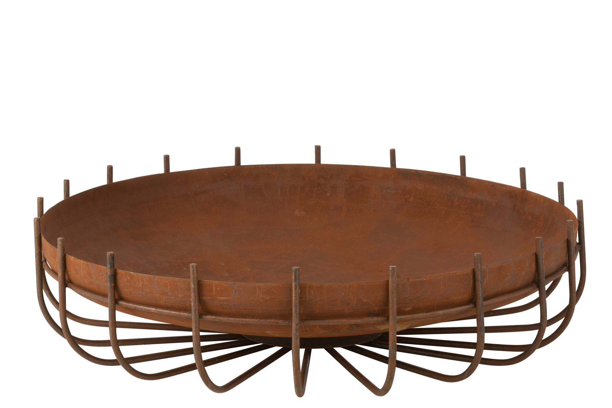 Großer, niedriger Feuerkorb aus 100 % Eisen in Rostoptik robust und dekorativ für Garten und Terrasse.