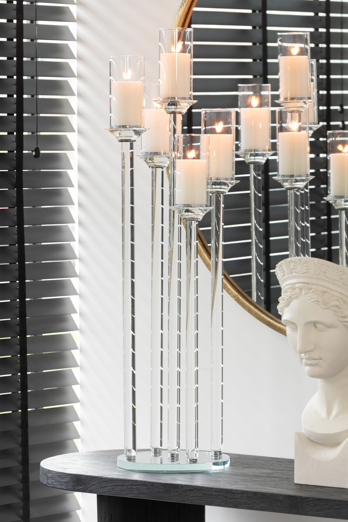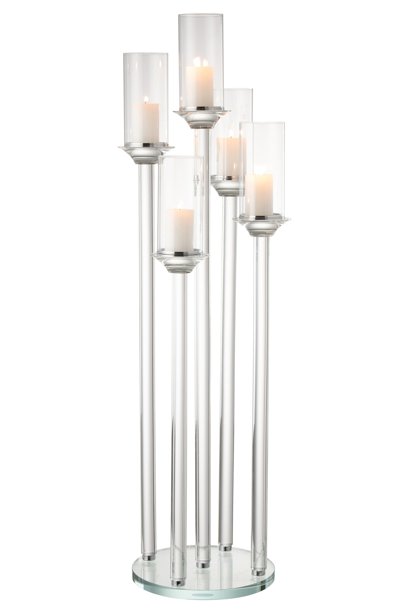 Großer Kerzenhalter aus Glas für fünf Kerzen mit elegantem Design für stilvolle und repräsentative Lichtakzente.