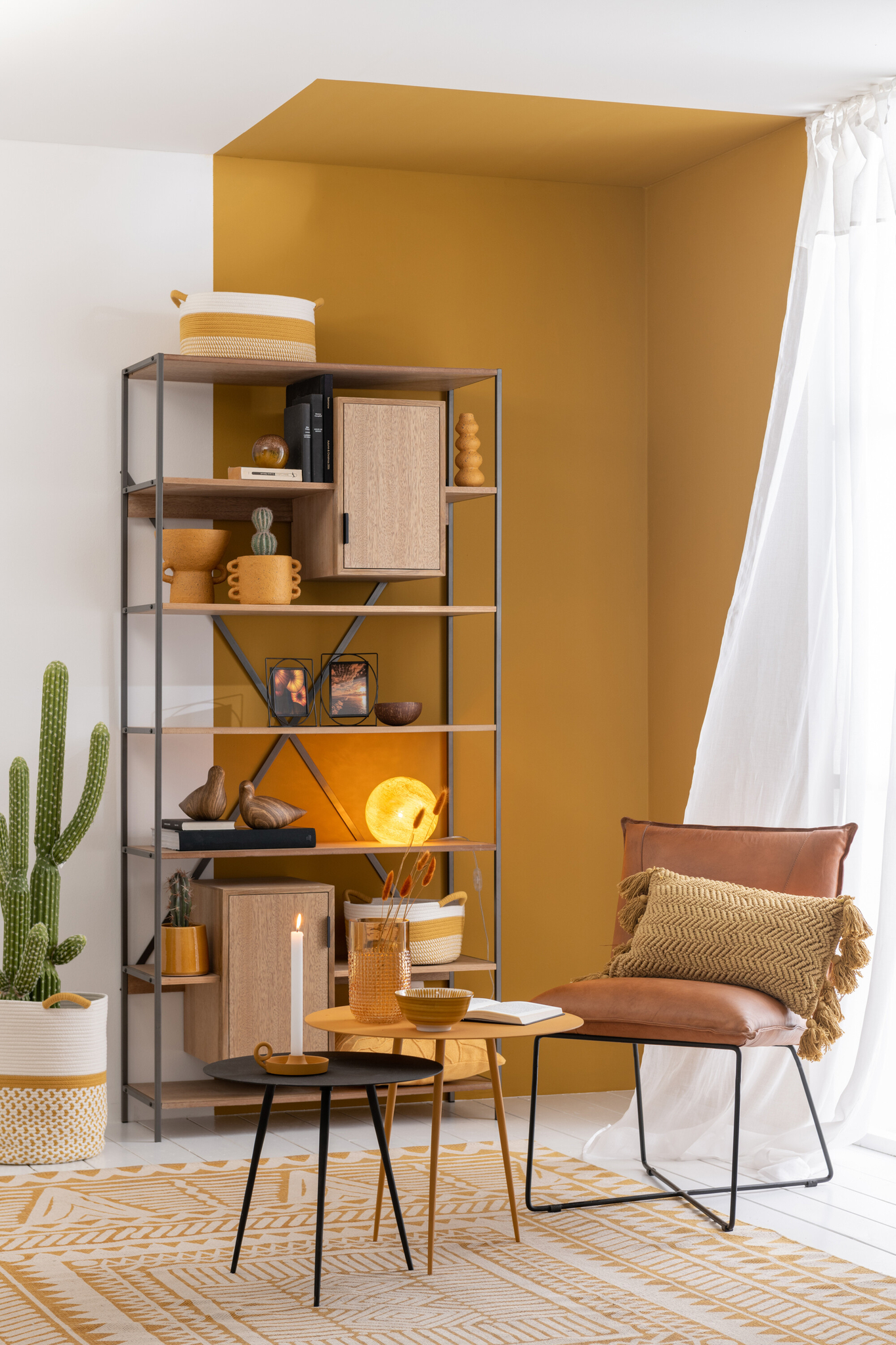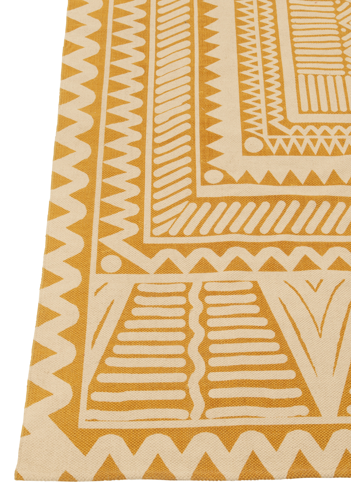 Eleganter großer Baumwollteppich in Weiß und Ocker für stilvolle Wohnräume.