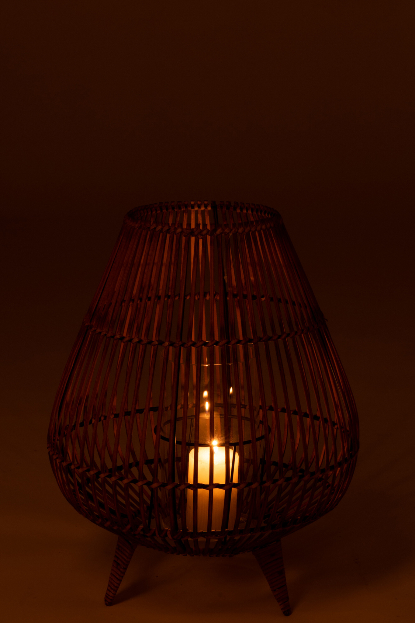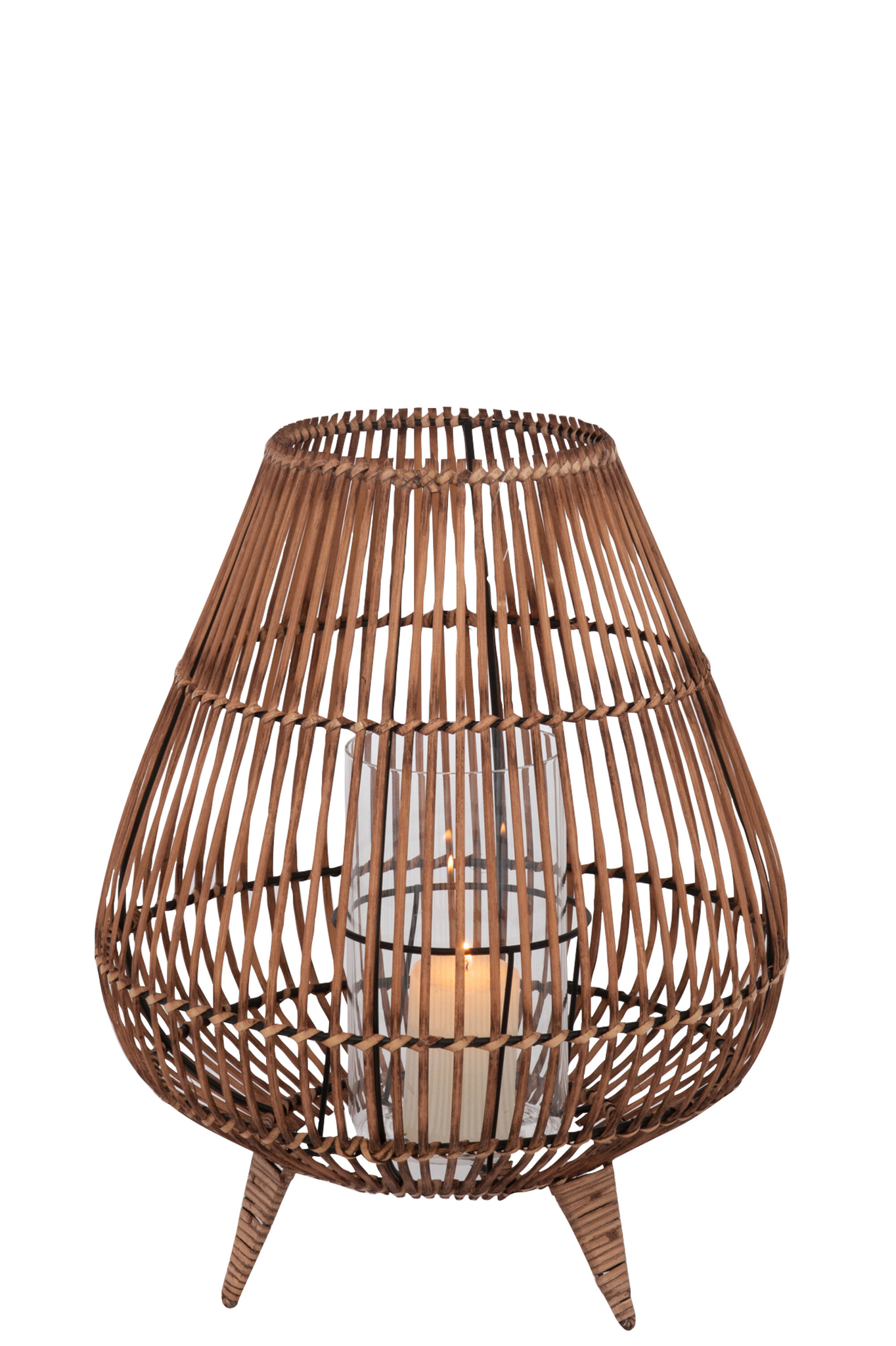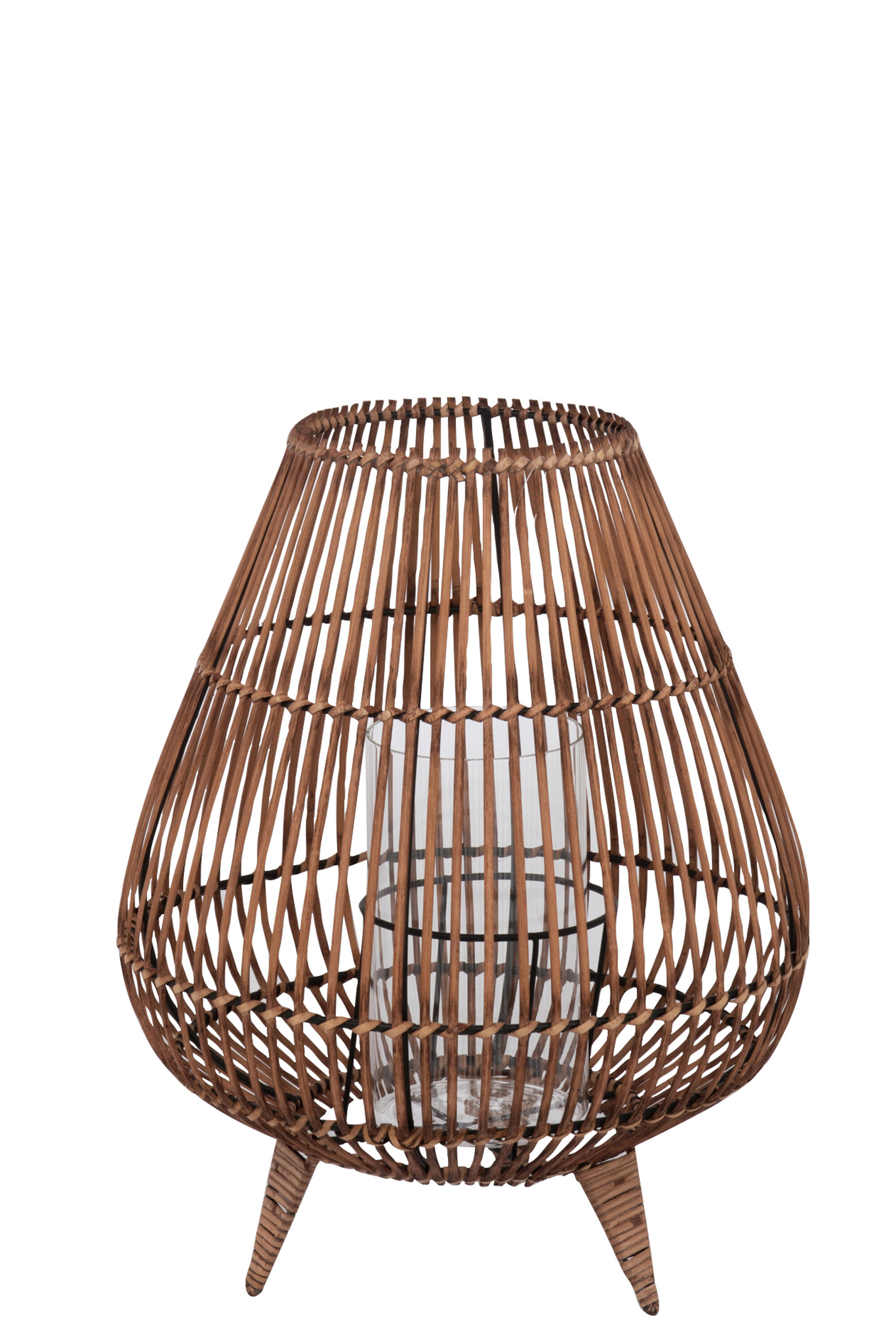 Elegante große Laterne auf Fuß aus Rattan und Glas für natürliche und stimmungsvolle Lichtakzente.