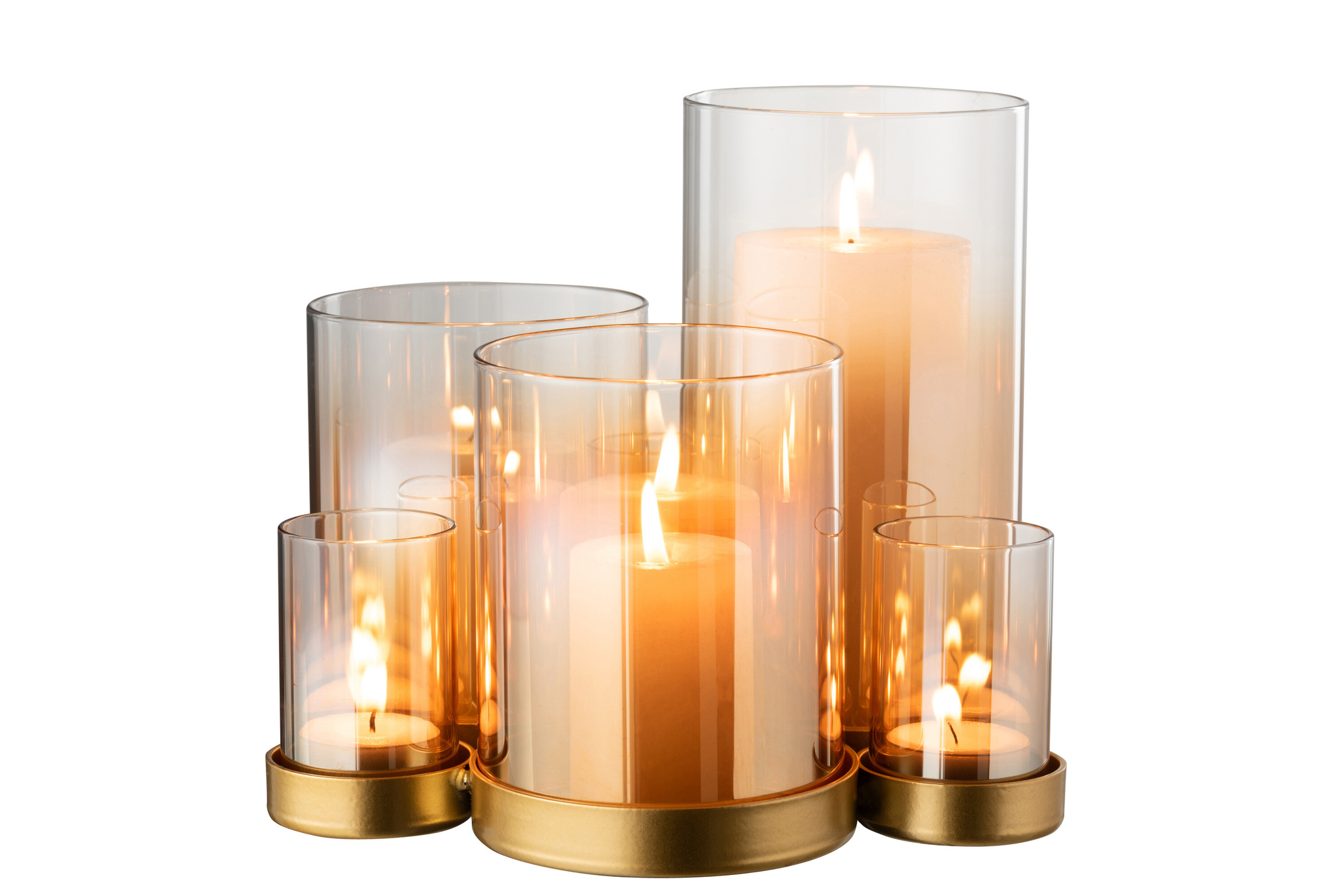 Elegantes 5er Set Hurricane aus Glas und Metall in Gold für stilvolle und zeitlose Wohnakzente.