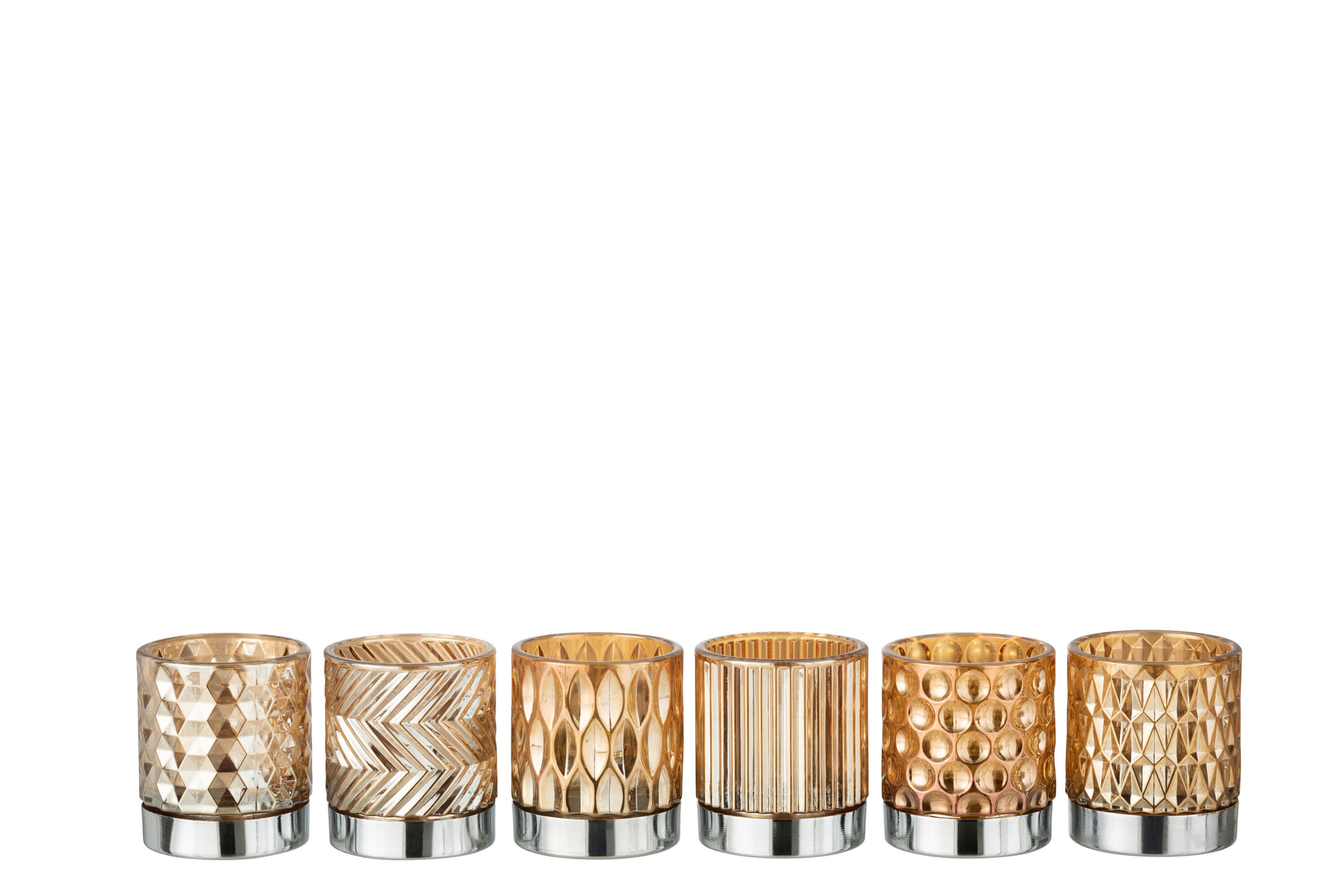 Klassisches 6er Set Hurricane-Gläser aus Glas und Metall in Gold für stilvolle und elegante Tischdekoration.