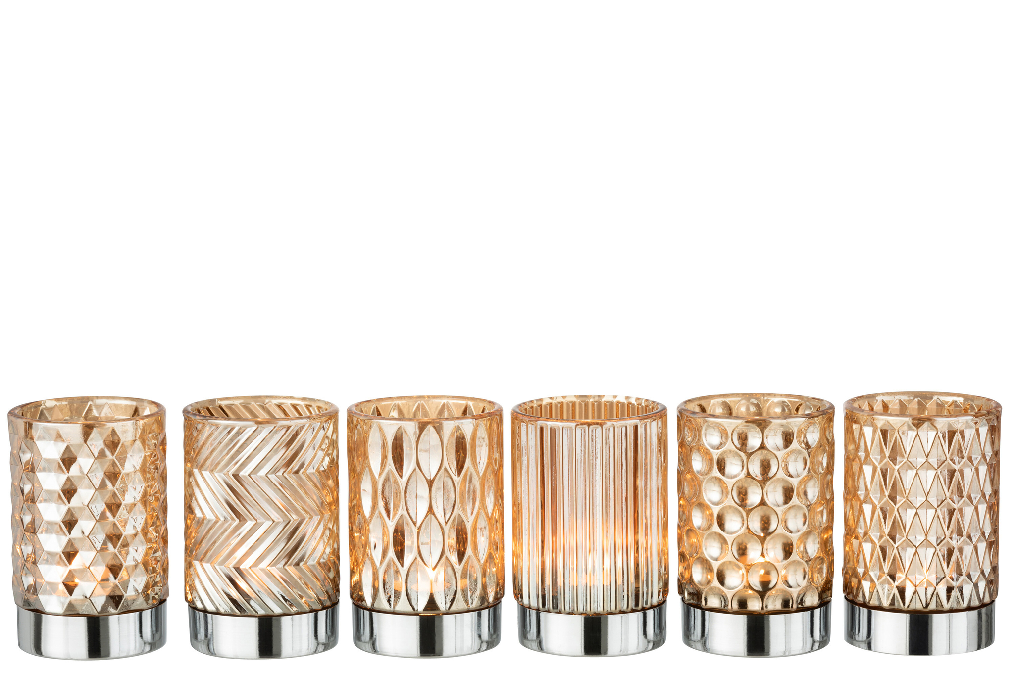 Dieses klassische 6-teilige Hurricane-Set überzeugt durch sein zeitloses Design und die hochwertige Kombination aus 80 % Glas und 20 % Metall in edler Goldoptik. Mit den Maßen 8,5 × 13 × 8,5 cm pro Stück sowie einem Gesamtgewicht von 0,5 kg wirkt das Set filigran und zugleich hochwertig verarbeitet. Die harmonische Materialverbindung sorgt für ein stilvolles Lichtspiel und macht die einzelnen Elemente zu vielseitig einsetzbaren Dekorationsobjekten. Ideal geeignet für elegante Tischarrangements, festliche Anlässe und anspruchsvolle Innenräume.