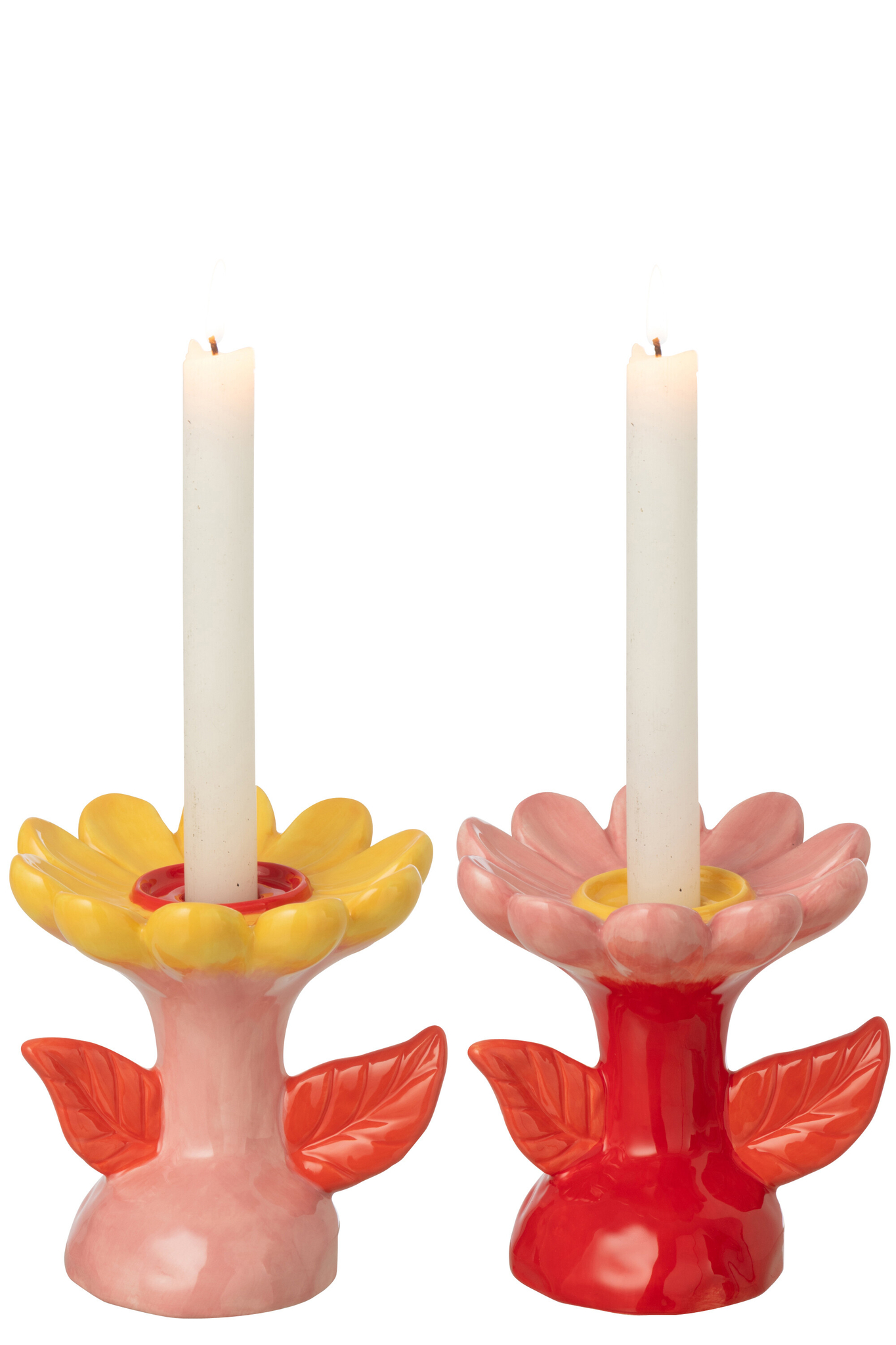 Elegantes 2er Set Kerzenhalter aus Steinzeug mit Blumenmotiv auf Sockel für farbenfrohe und stilvolle Wohnakzente.