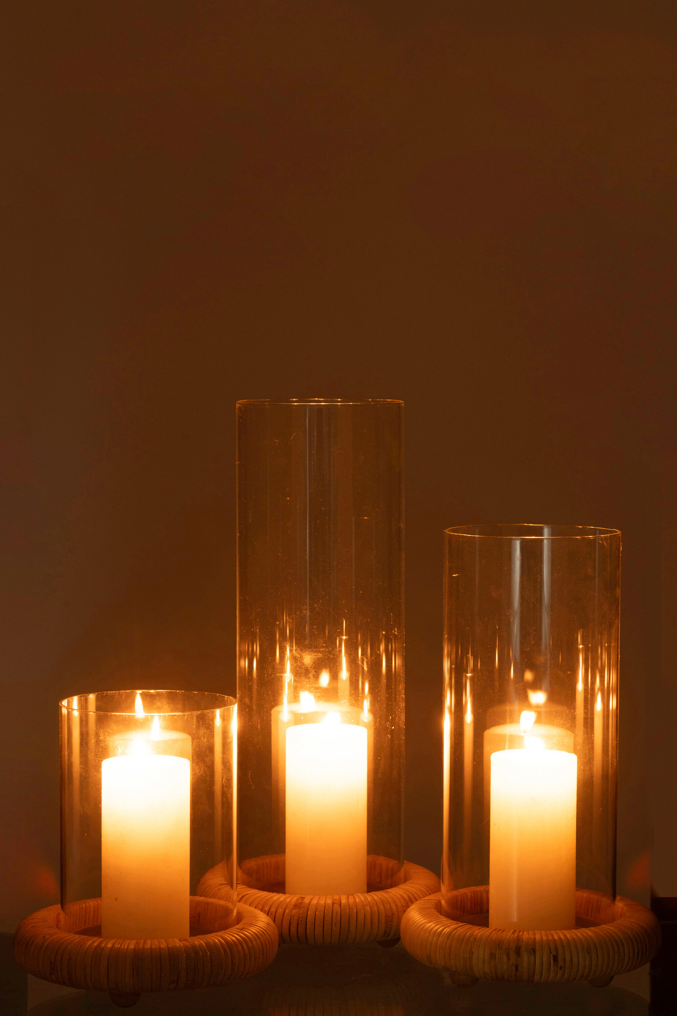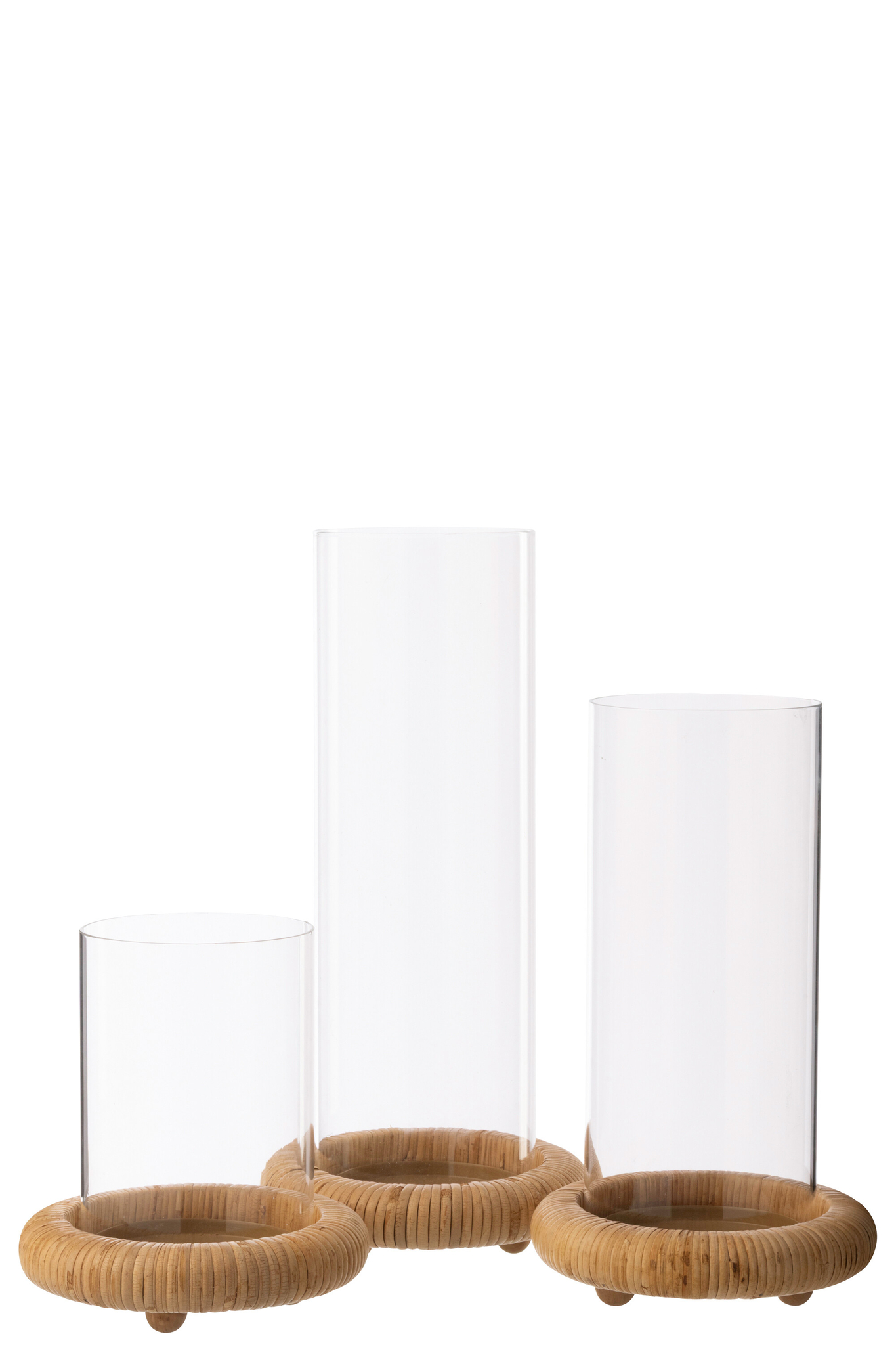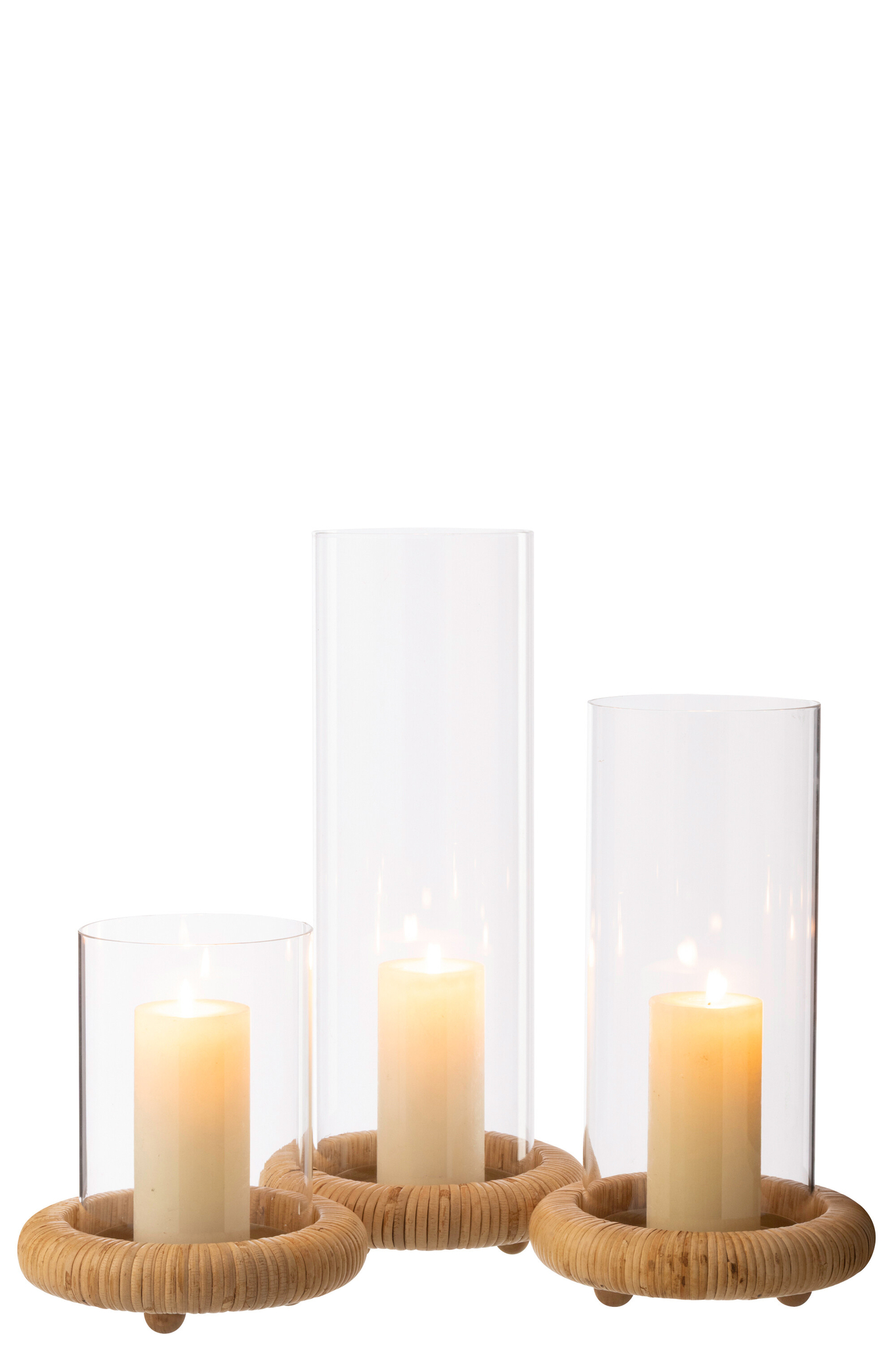 Das Set besteht aus drei runden Kerzenhaltern auf stabilen Sockeln und vereint Glas mit natürlichen Materialien wie Rattan, MDF und Eisen in einer harmonischen Kombination. Der warme Naturton sorgt für eine gemütliche Ausstrahlung und macht die Kerzenhalter zu einer stilvollen Ergänzung für anspruchsvolle Tischdekorationen. Durch die ausgewogene Materialzusammensetzung von 50 % Glas, 20 % Rattan, 20 % MDF und 10 % Eisen entsteht ein hochwertiger Look, der sowohl Eleganz als auch Natürlichkeit vermittelt und für eine stimmungsvolle Beleuchtung sorgt.