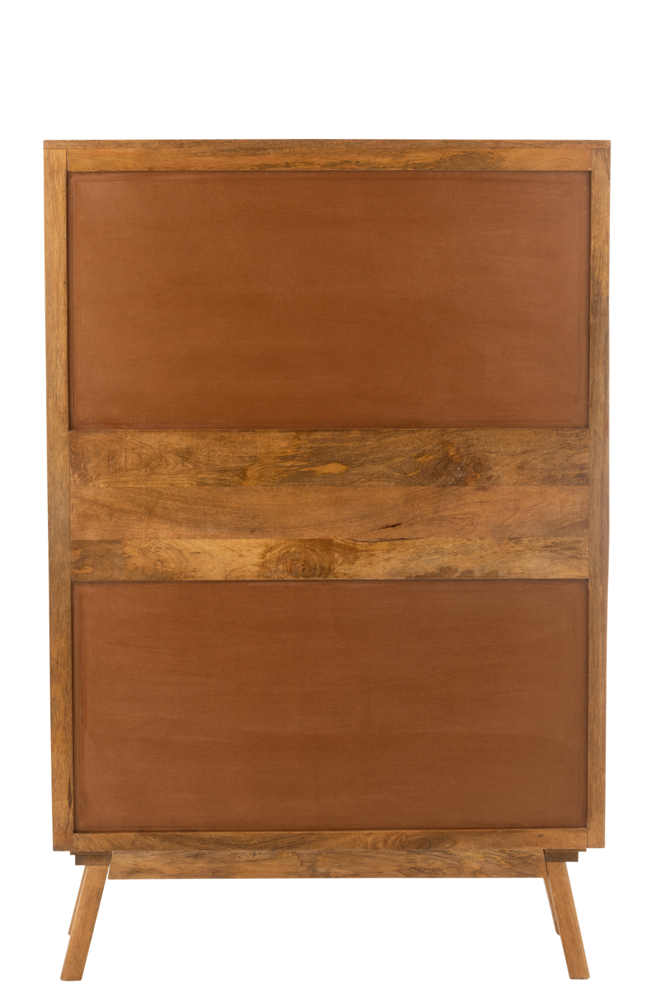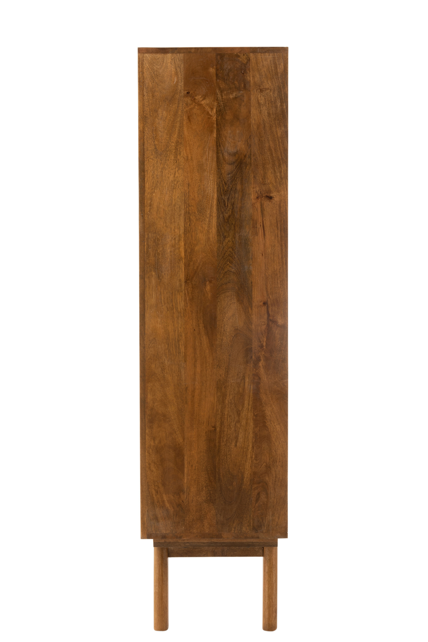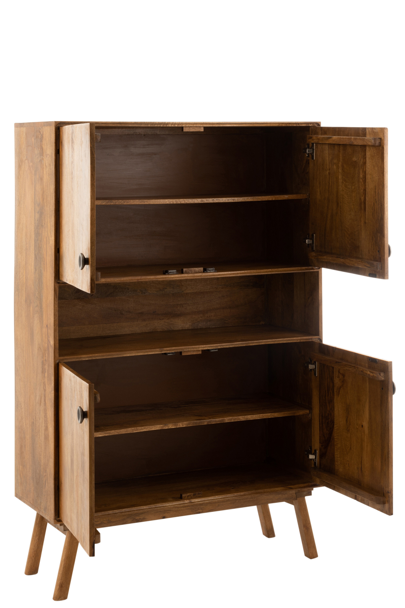 Kleiderschrank Lora mit vier Türen aus 85 % Mangoholz, 10 % MDF und 5 % Eisen in Braun. Das elegante und robuste Möbelstück bietet großzügigen Stauraum für Kleidung und Accessoires und ist ein stilvoller Blickfang für anspruchsvolle Wohnräume. Maße: 40 × 158 × 104 cm, Gewicht: 70,3 kg. Teilmontage erforderlich.