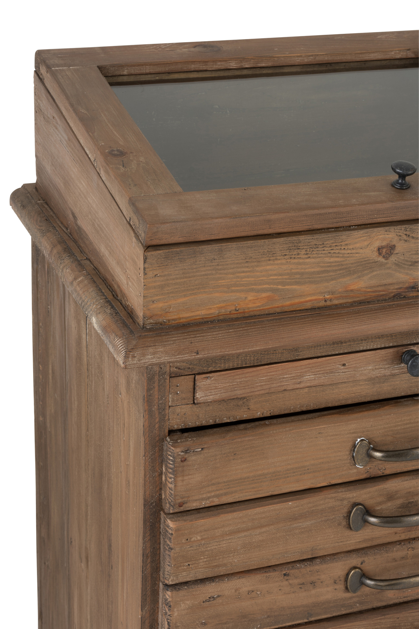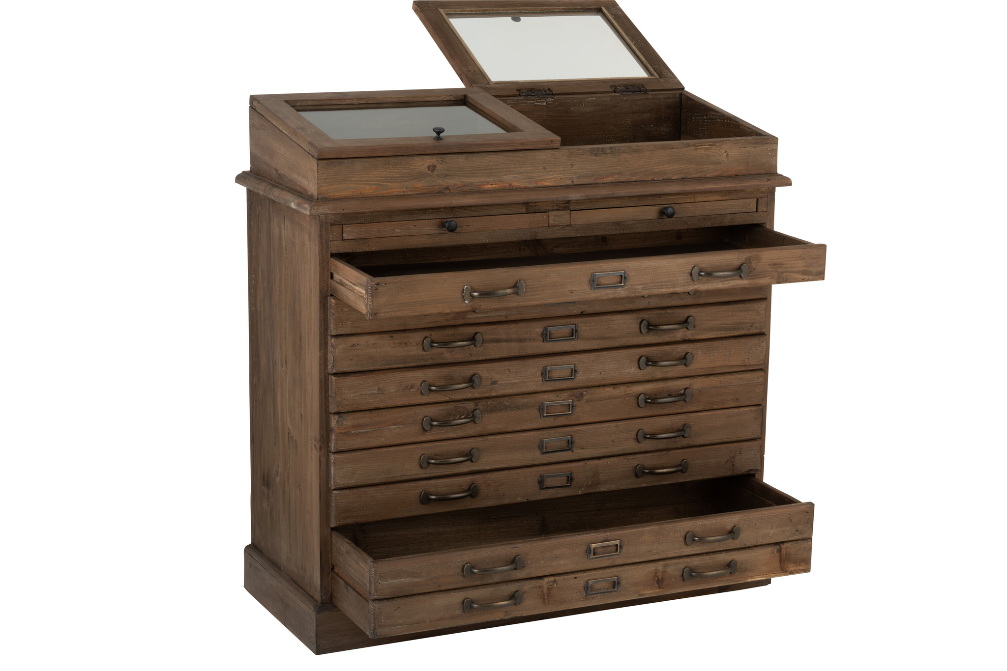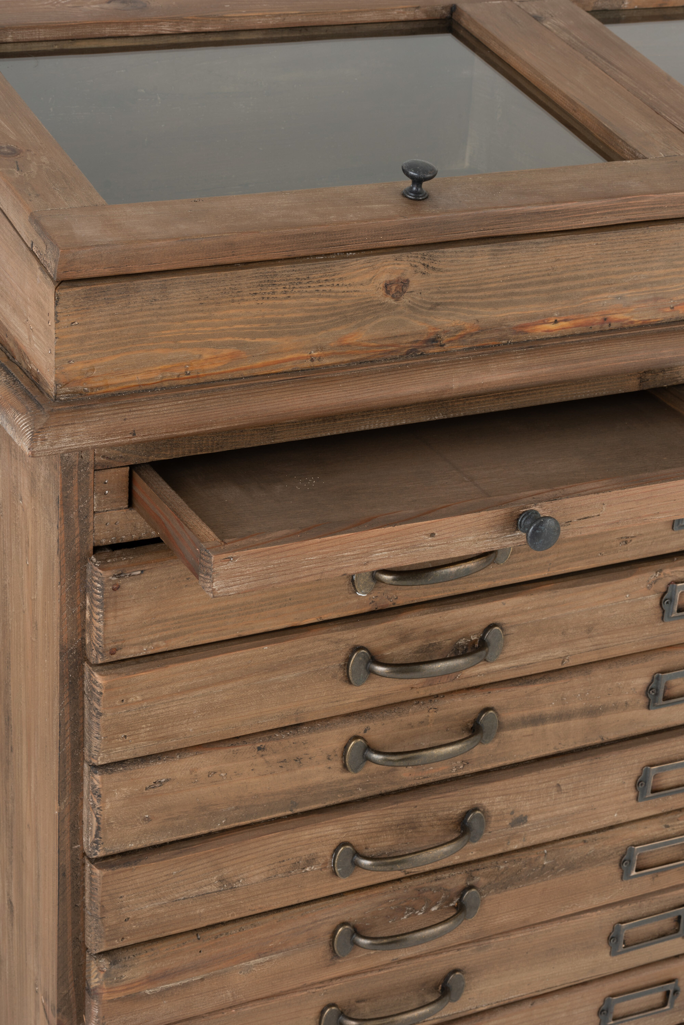 Braune Kommode mit Vitrine aus Recyclingholz, Sperrholz und Glas für stilvollen Stauraum.