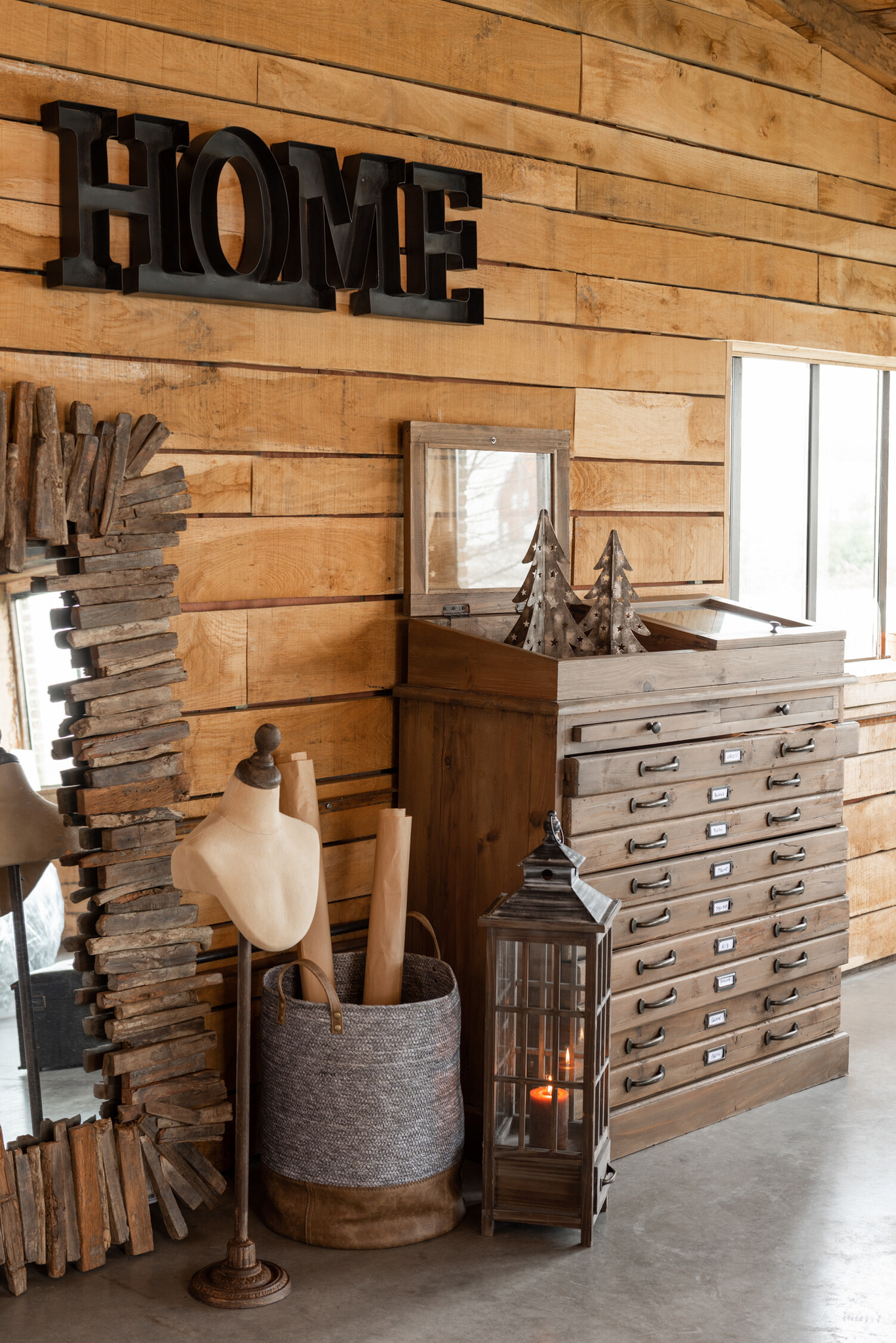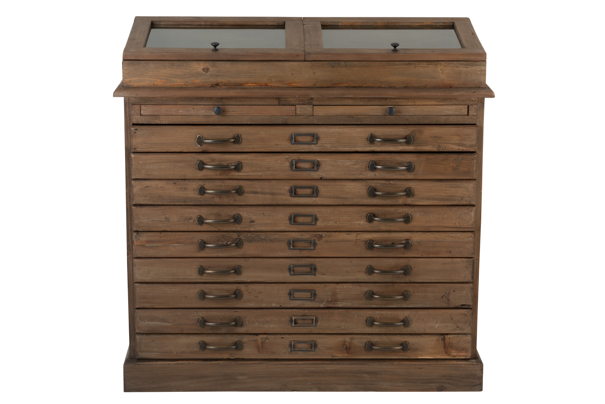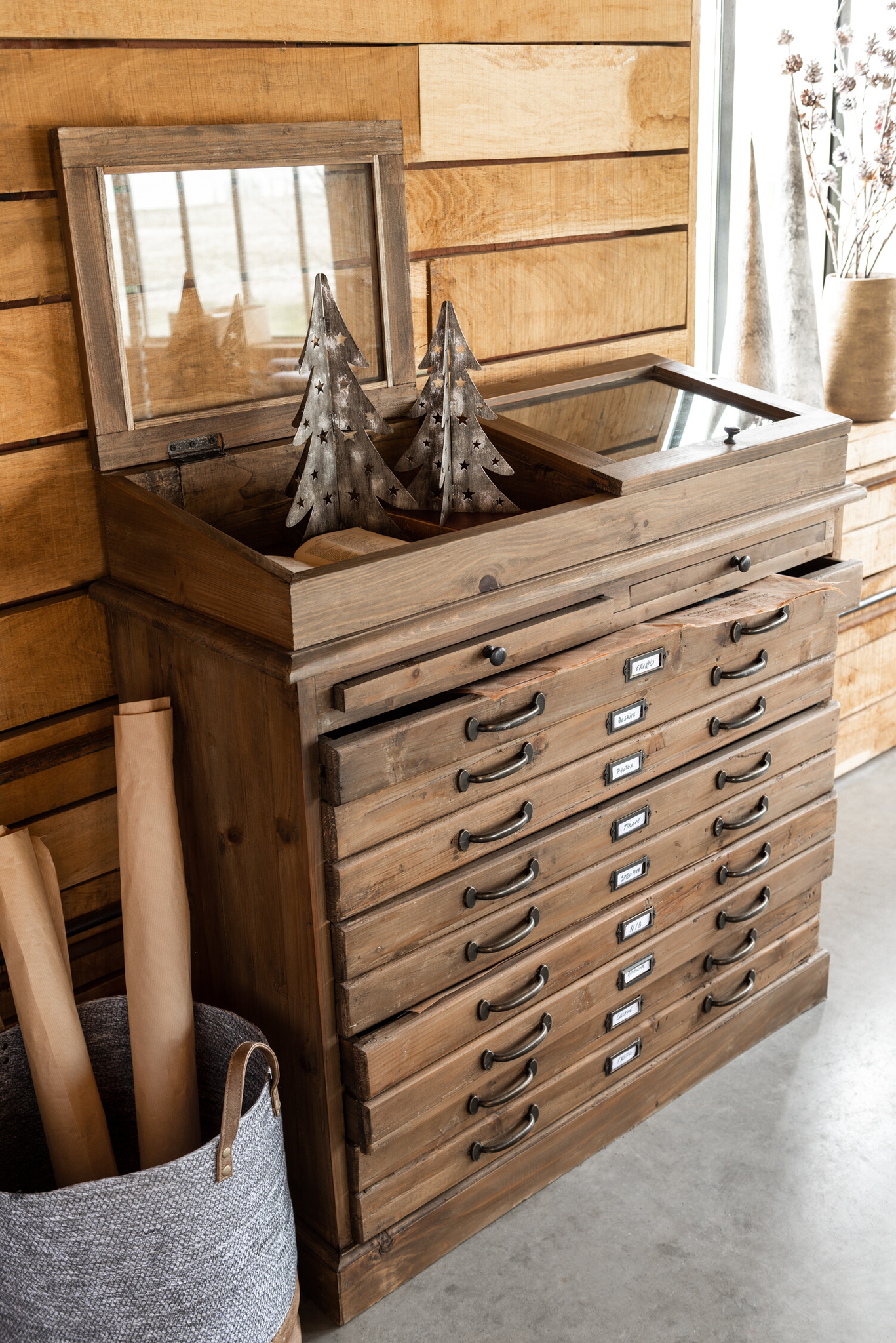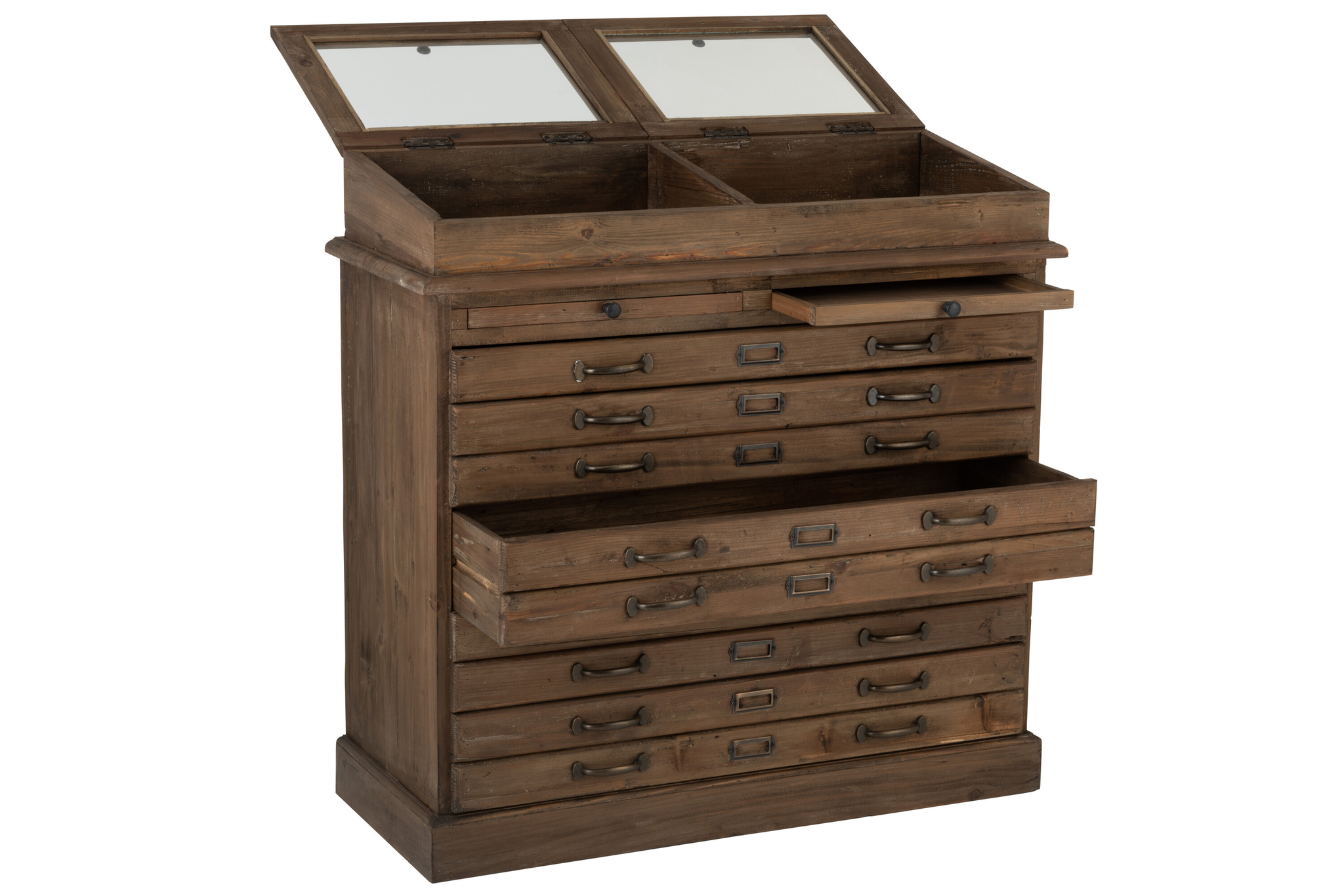 Braune Kommode mit Vitrine aus Recyclingholz, Sperrholz und Glas für stilvollen Stauraum.