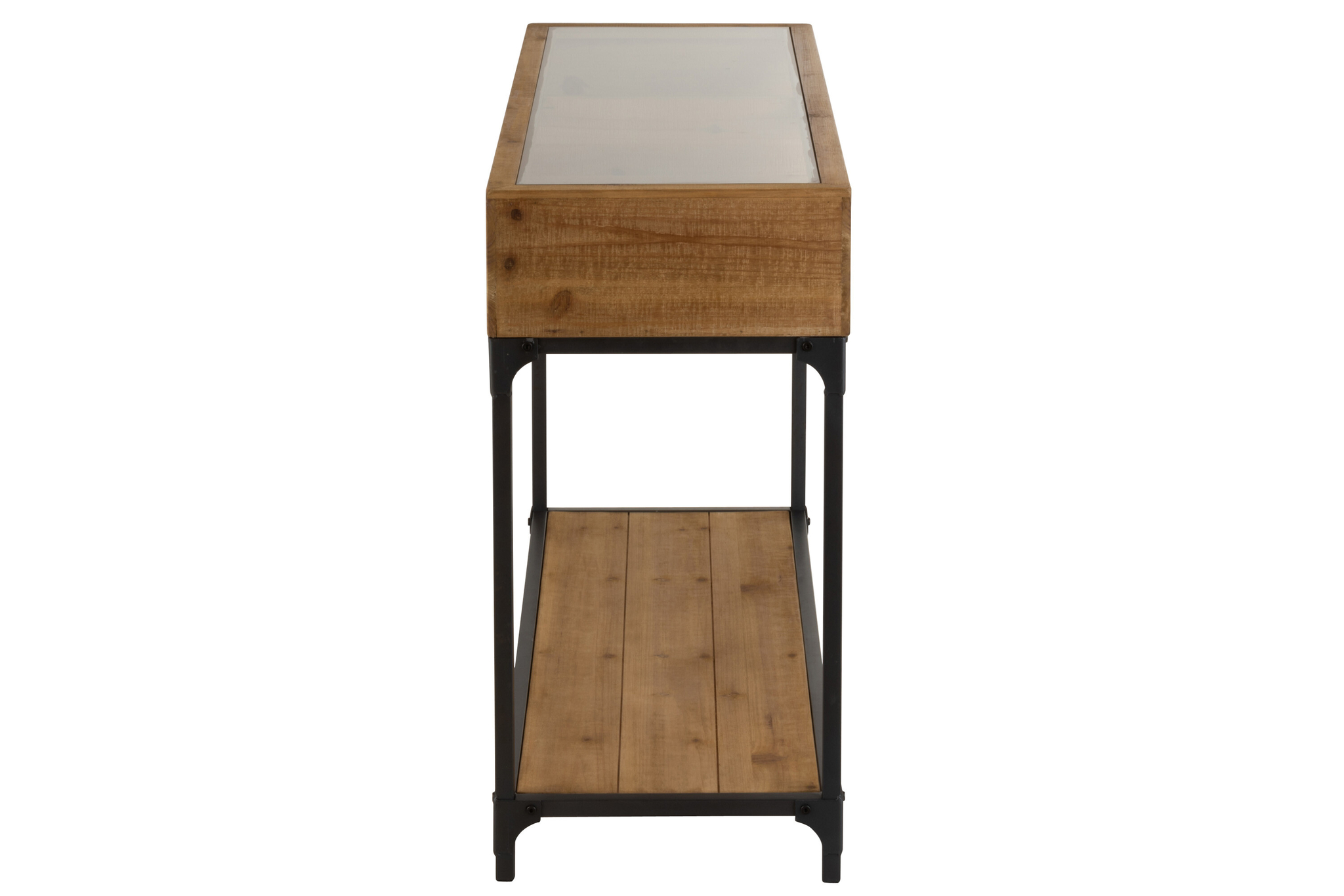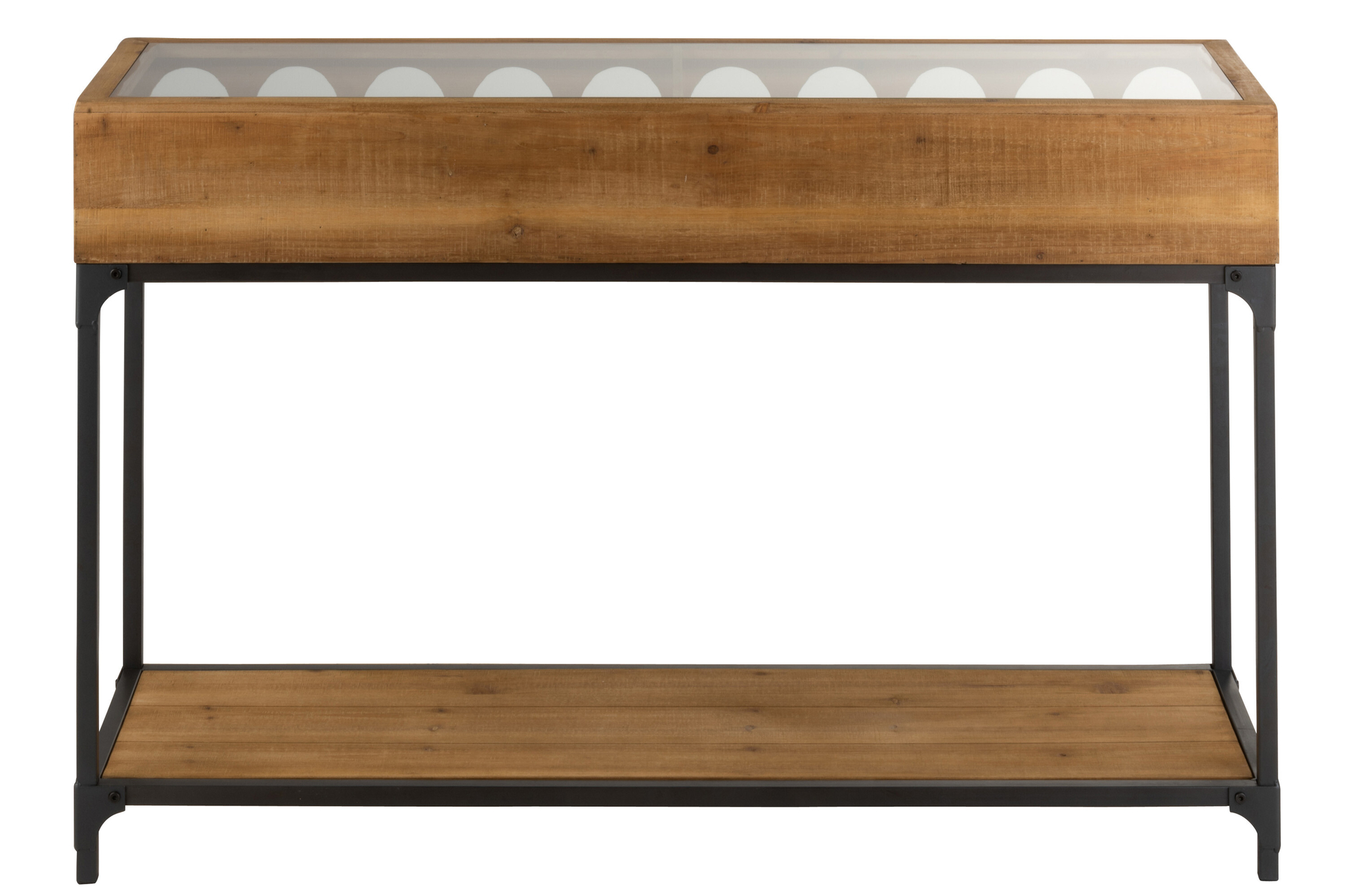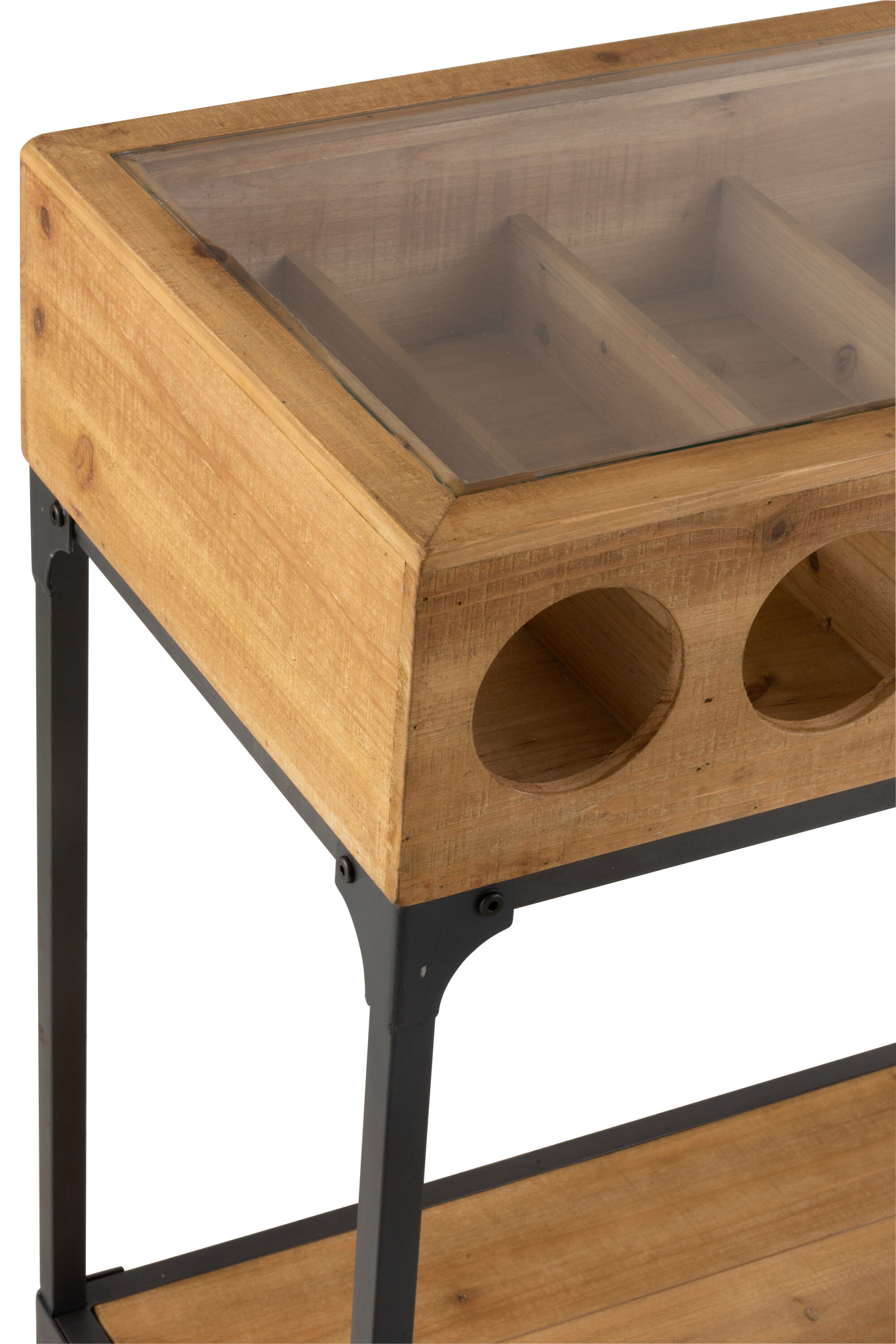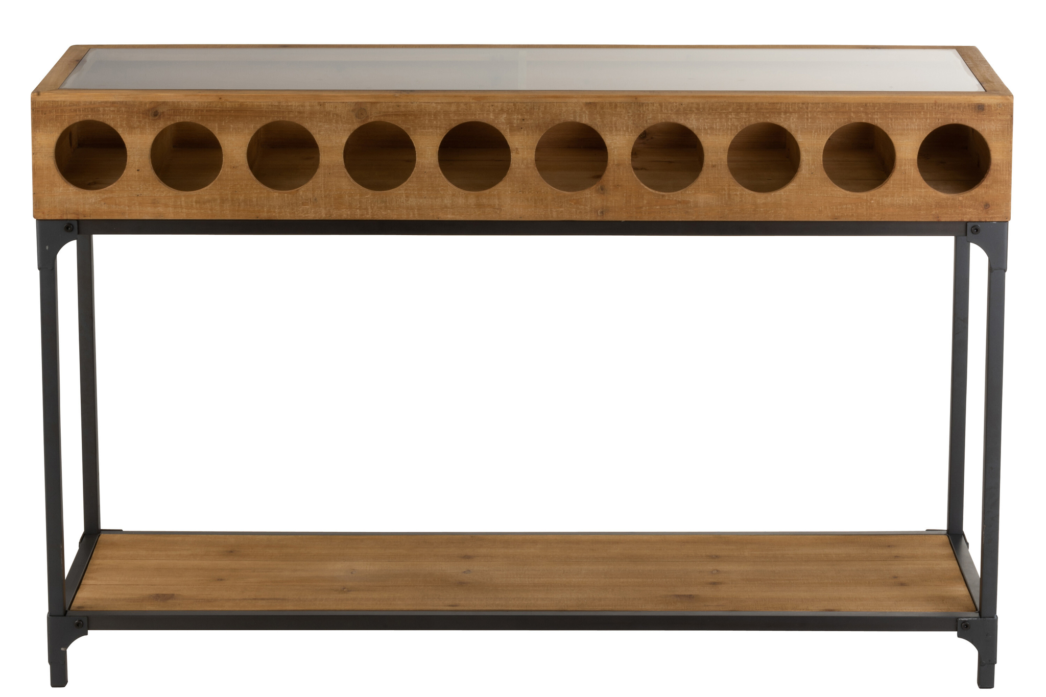 Elegante Weinflaschen-Konsole aus Fichtenholz, Stahl und Glas in Natur, funktional und stilvoll für Wohn- oder Gastronomieräume.