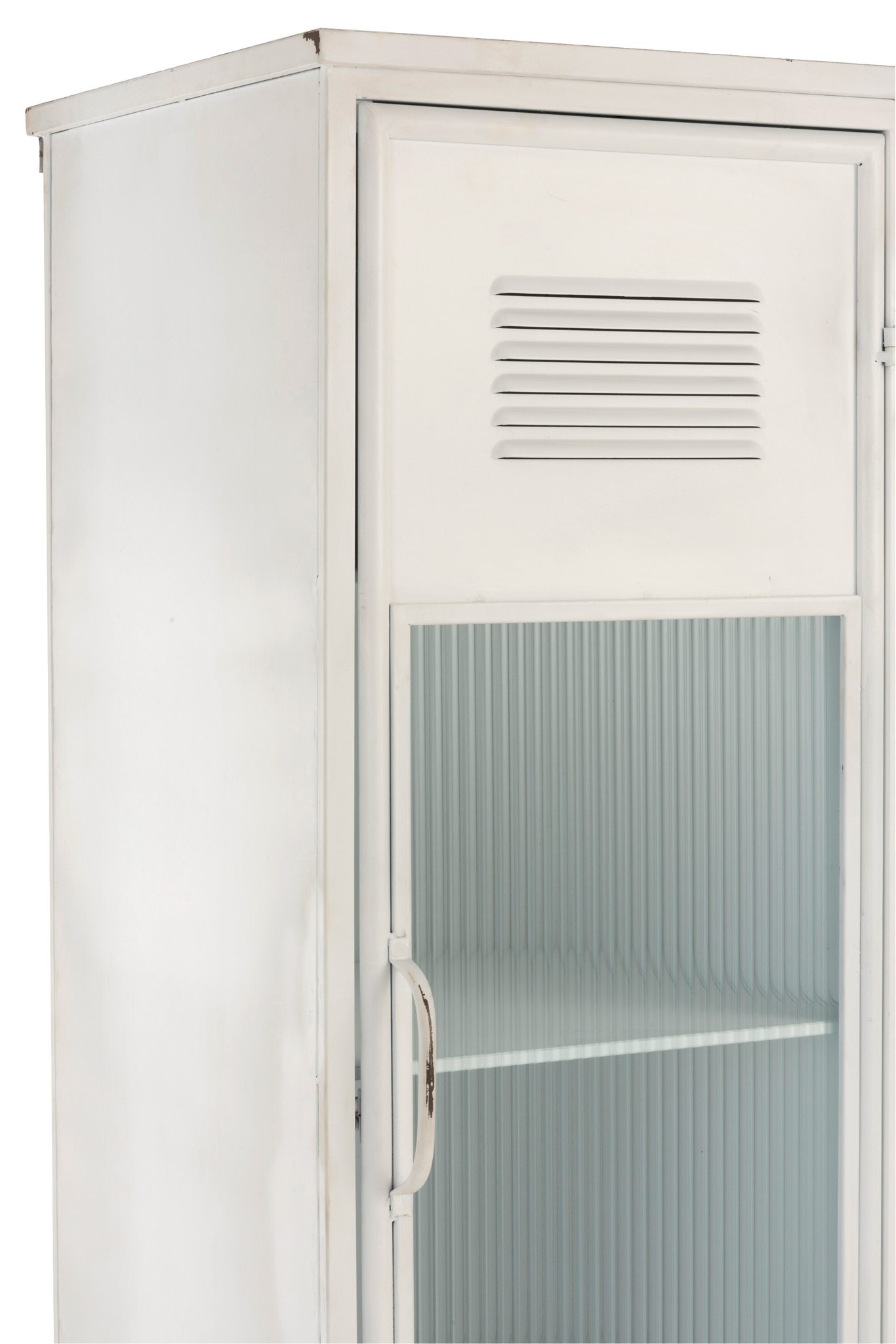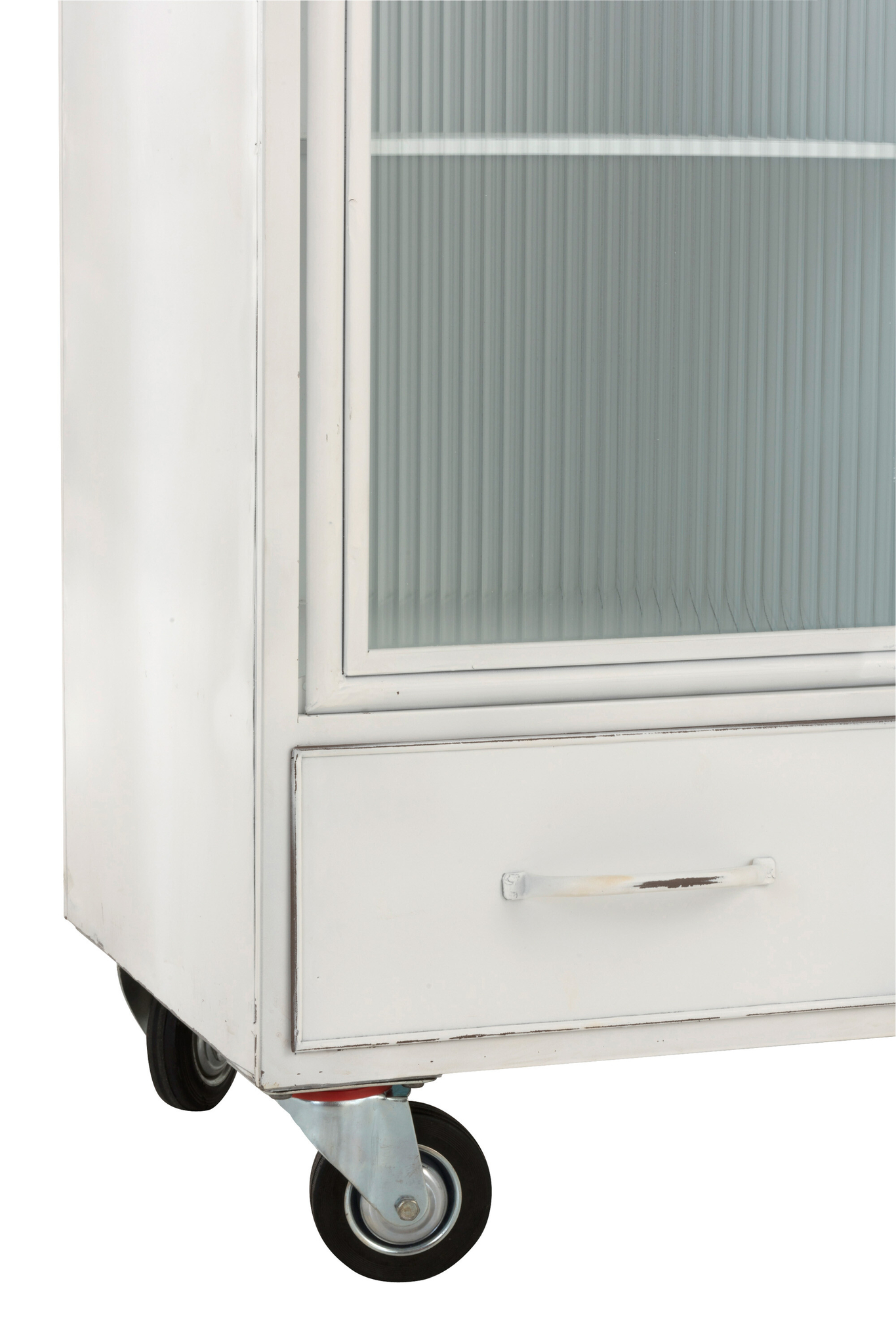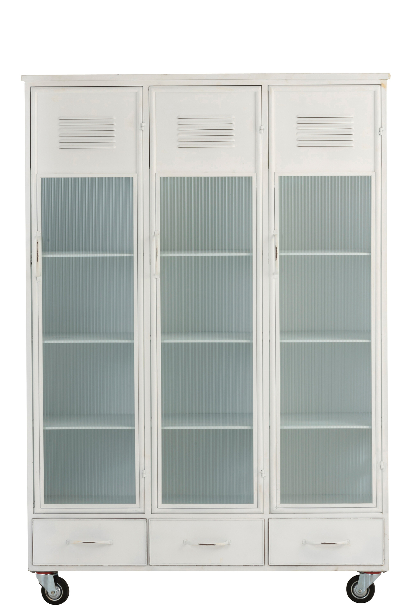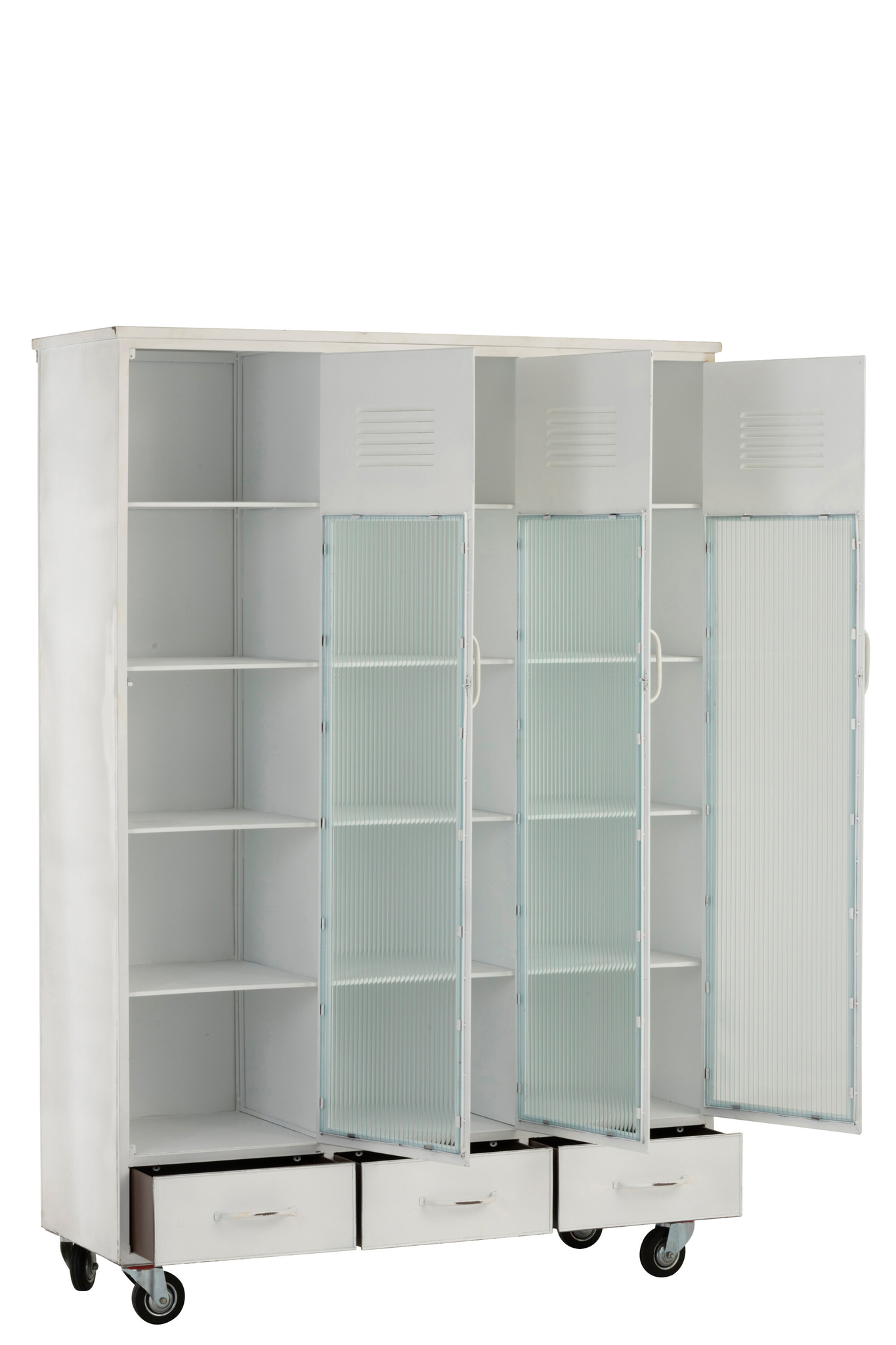 Robuster weißer Metallschrank mit drei Türen und drei Schubladen für vielseitigen Stauraum.