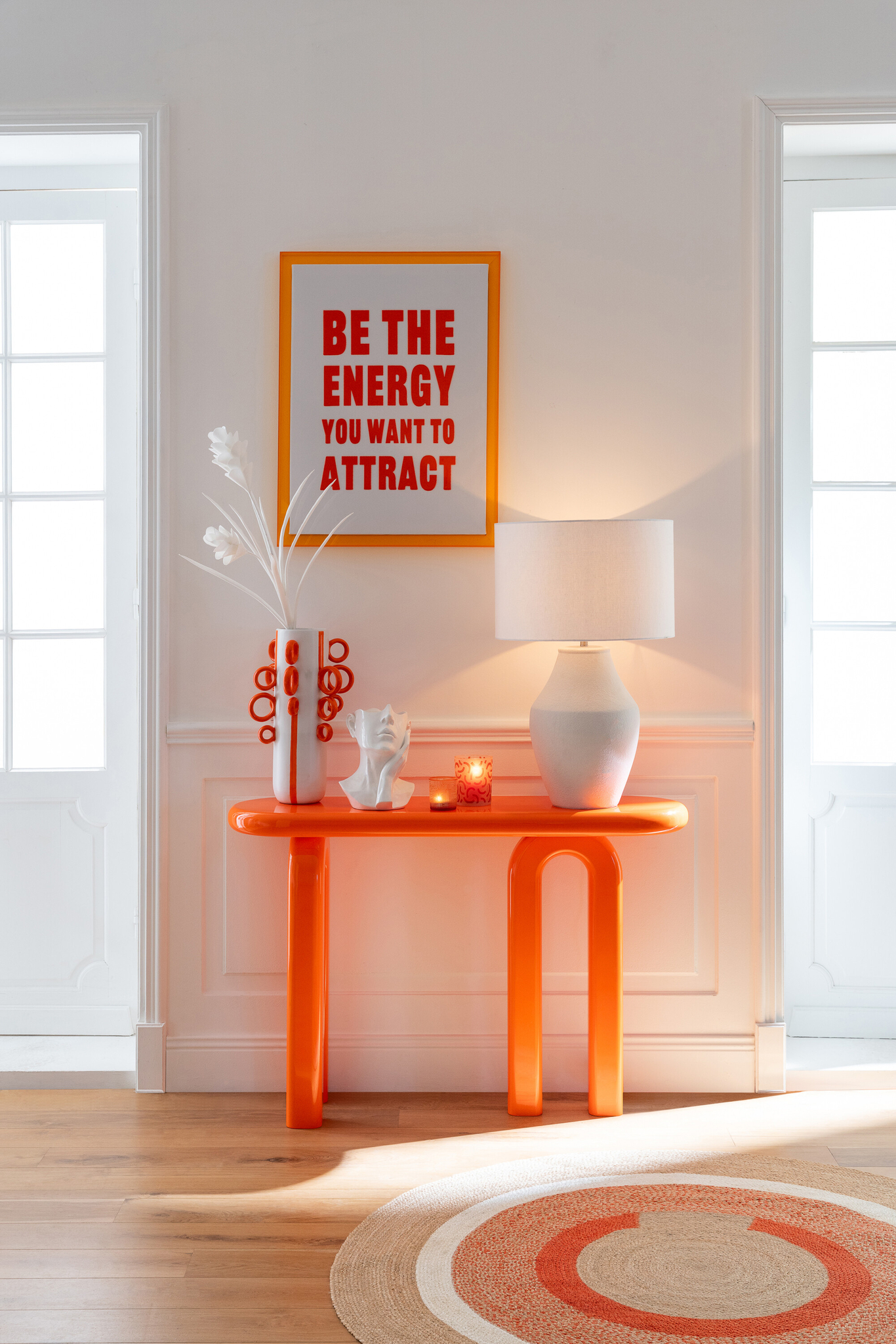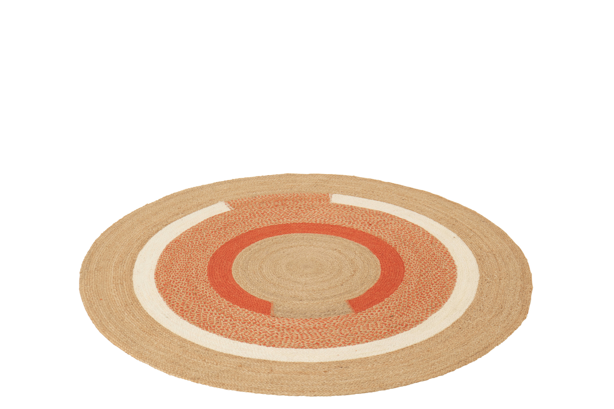 Der runde Teppich besteht aus 98 % Jute und 2 % Polyester und überzeugt durch seine natürliche, robuste und zugleich elegante Materialqualität. Mit einem Durchmesser von 150 Zentimetern, einer Höhe von 0,5 Zentimetern und einem Gewicht von 2,25 Kilogramm ist er leicht und vielseitig einsetzbar. Das geometrische Muster in Natur und Dunkelorange verleiht dem Teppich eine moderne und zugleich warme Ausstrahlung. Er eignet sich ideal für verschiedene Wohnbereiche und setzt stilvolle, dezente Akzente mit natürlichem Charakter.