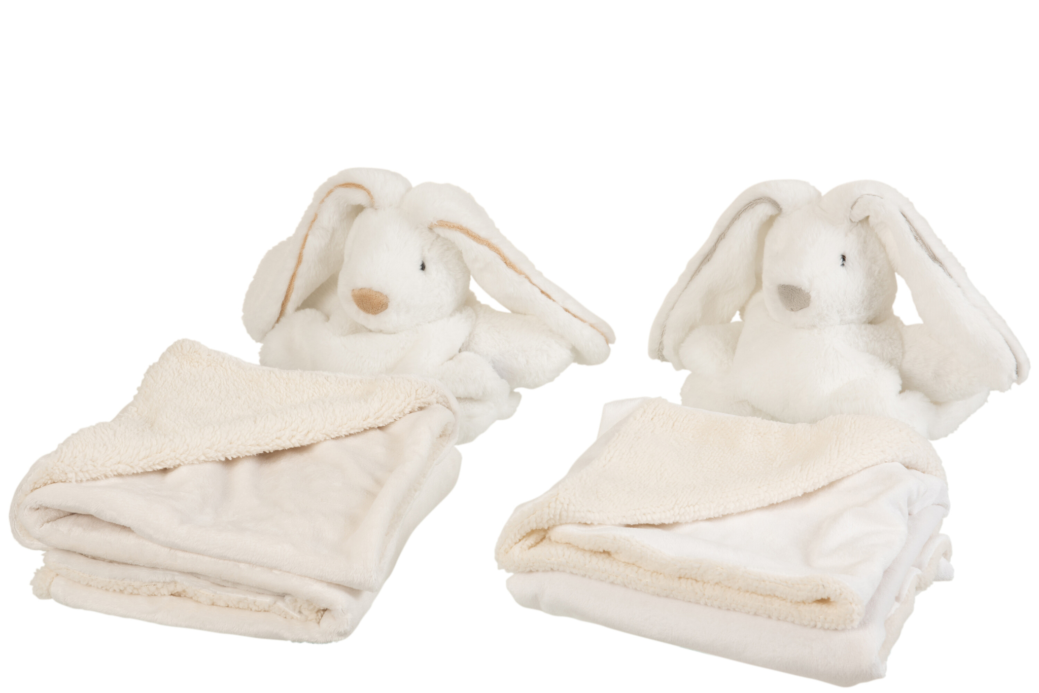 Zwei weiße Plüschhäschen mit Decke aus Polyester, weich, pflegeleicht und ideal als Geschenk oder Dekoration.