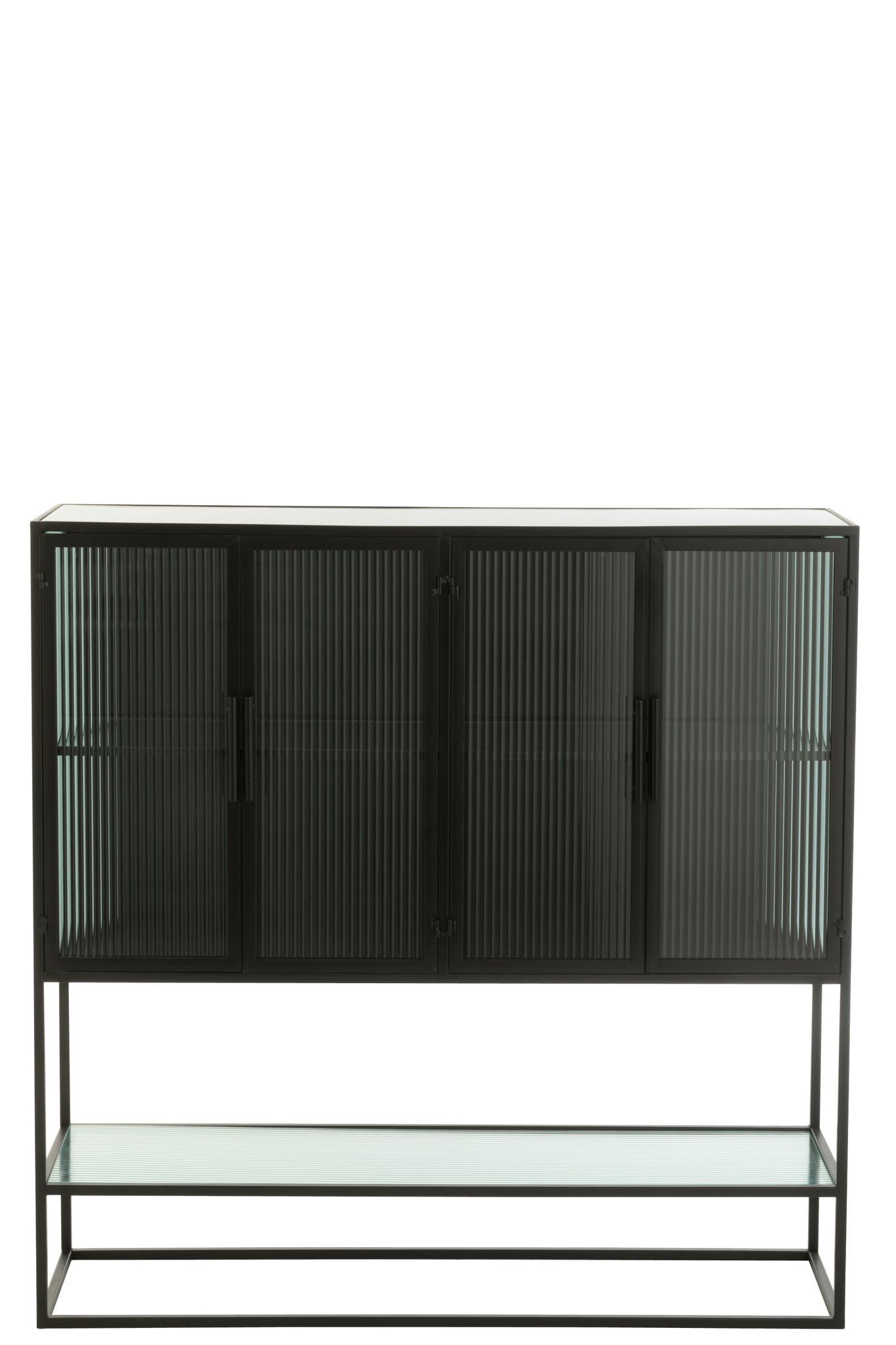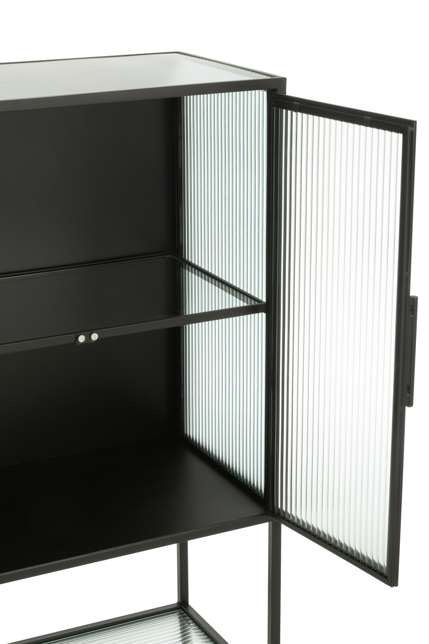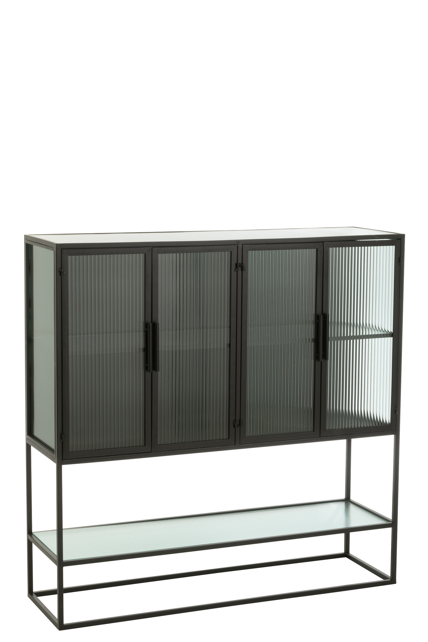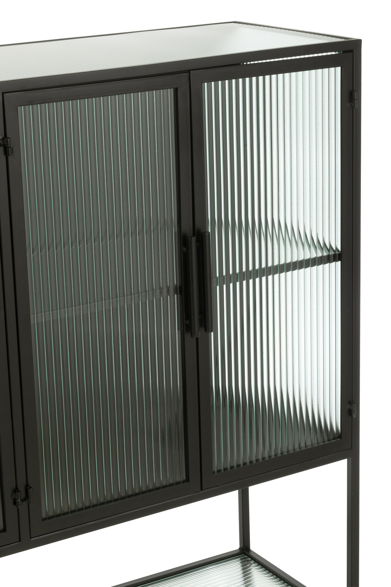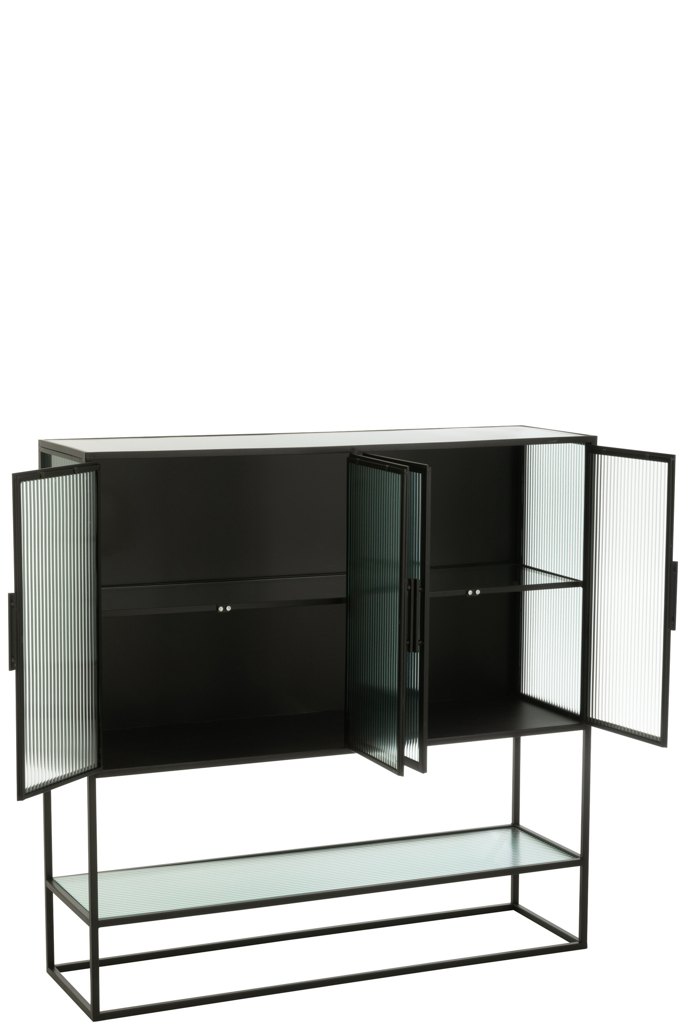 Schwarzer Rahmenschrank aus Eisen und Glas mit vier Türen dekorativ und funktional für Wohnräume.