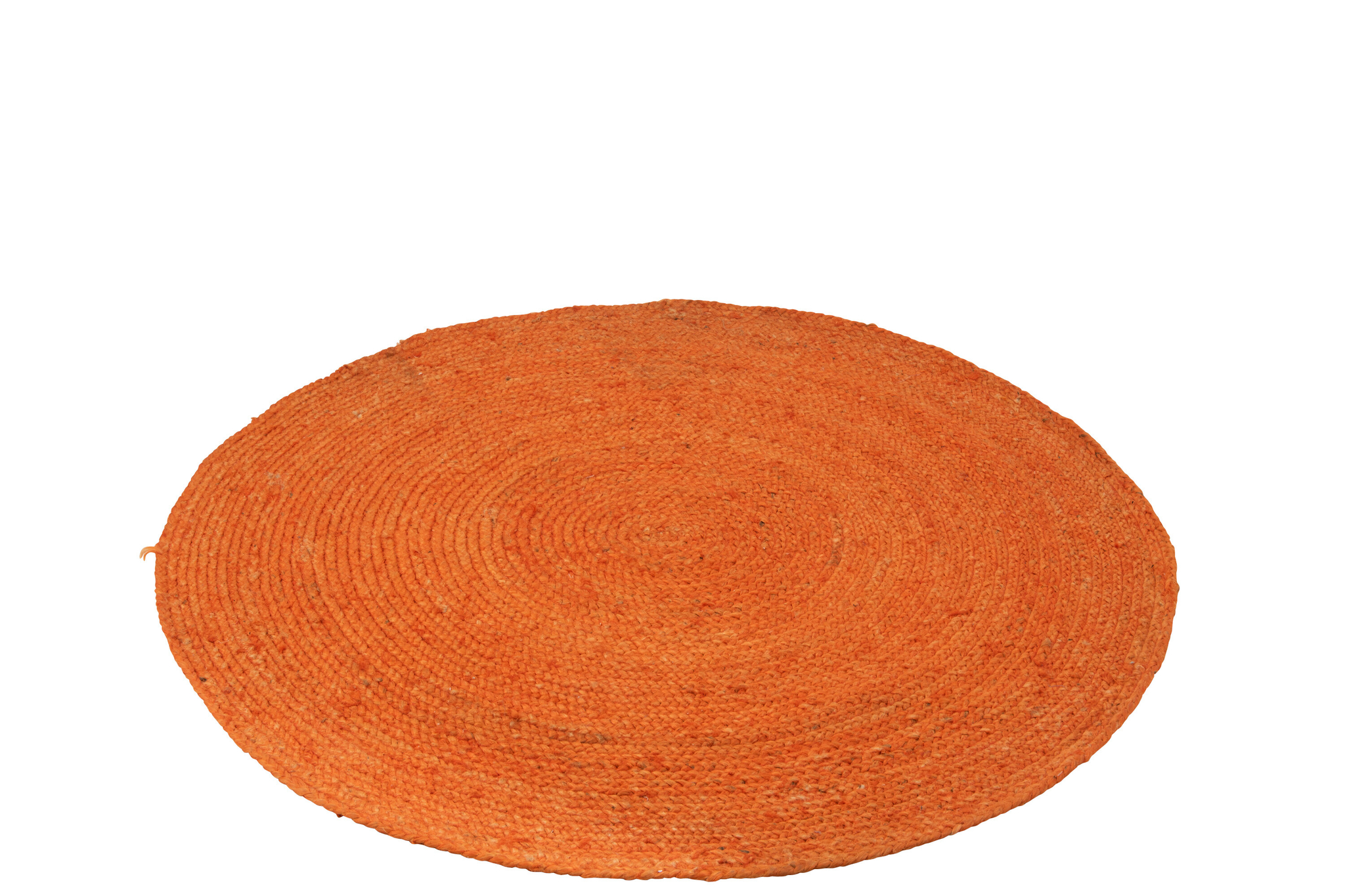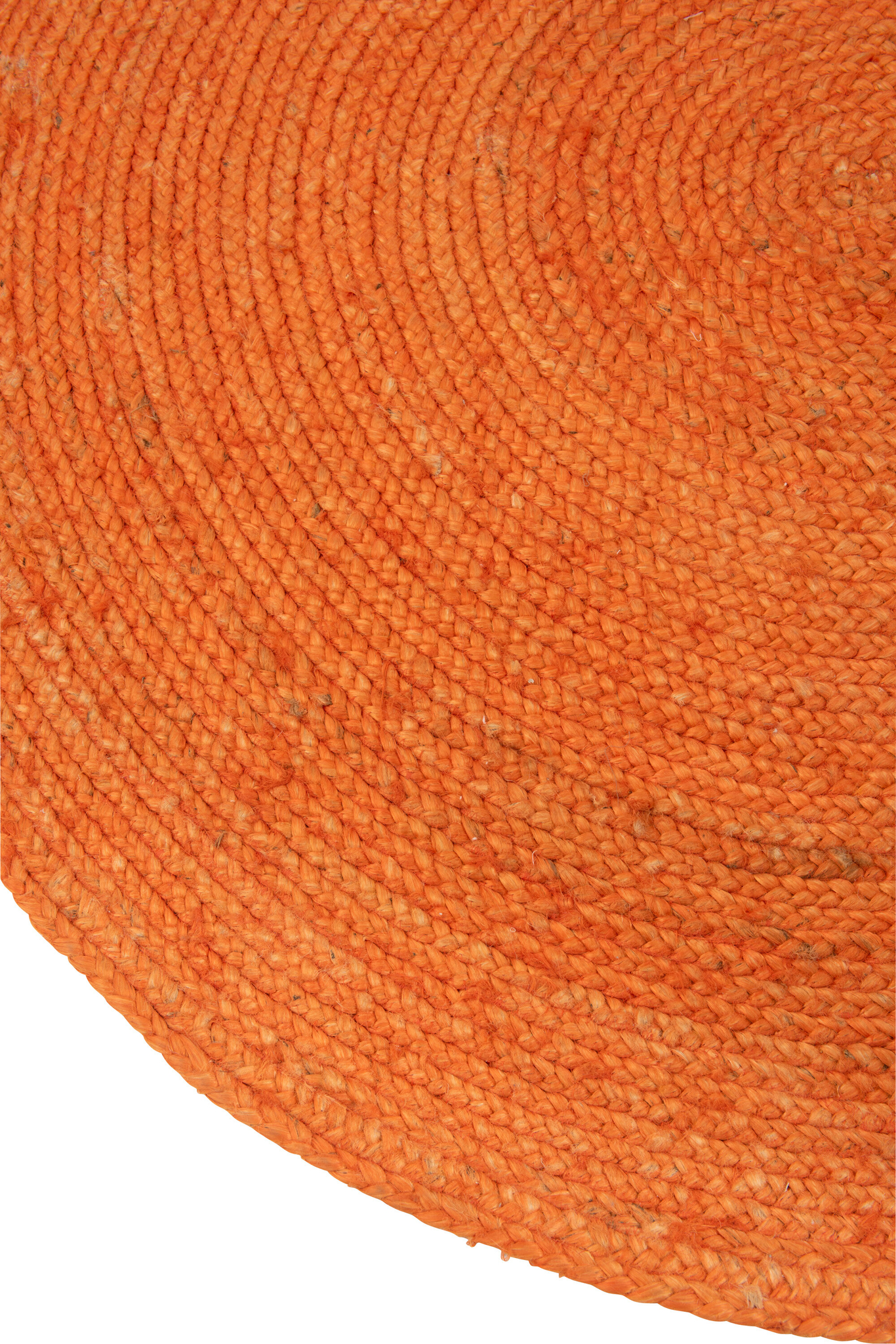Runder Teppich aus 100 % Jute in warmen Orange- und Rosttönen für natürliche Wohnakzente.
