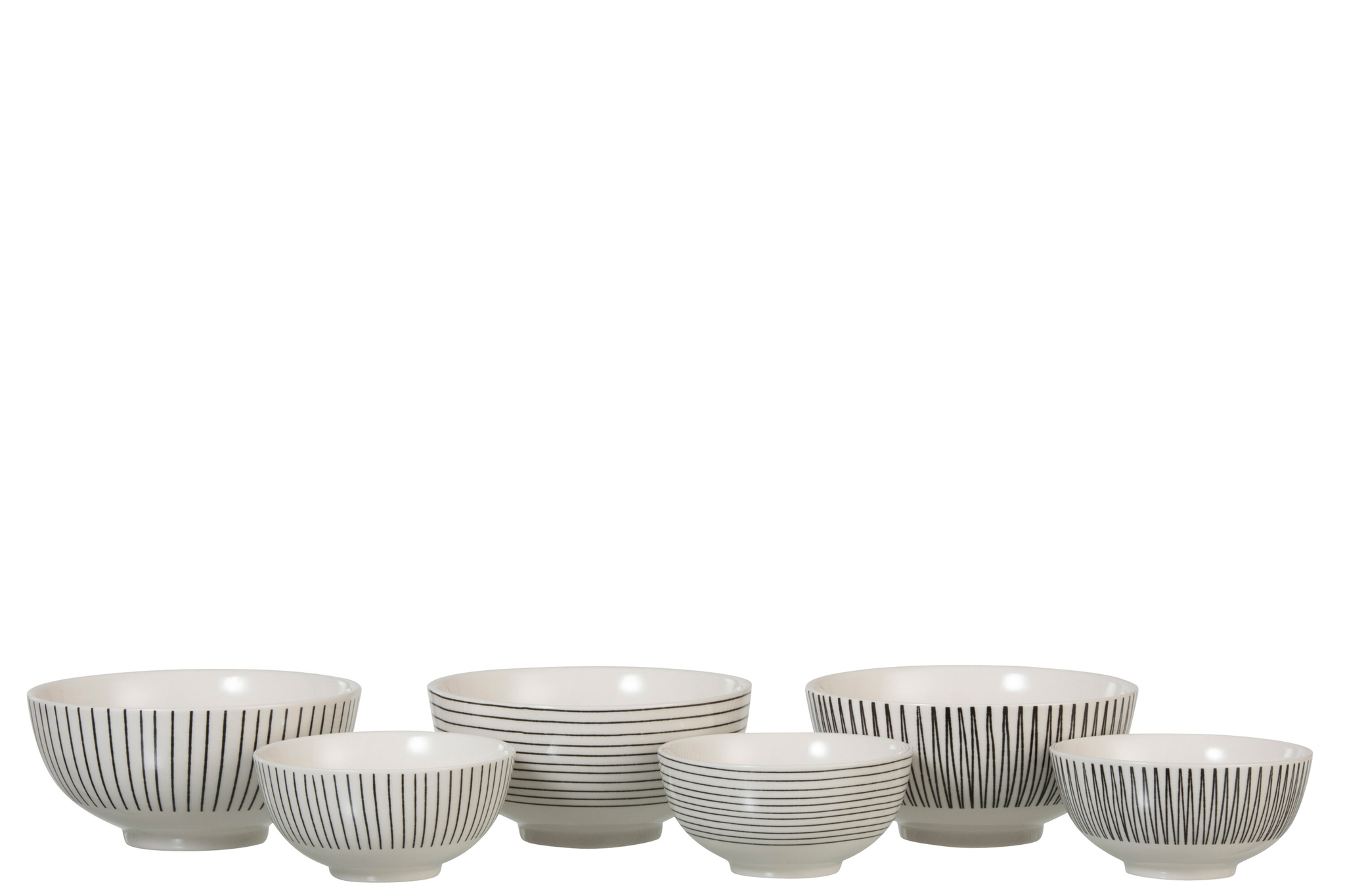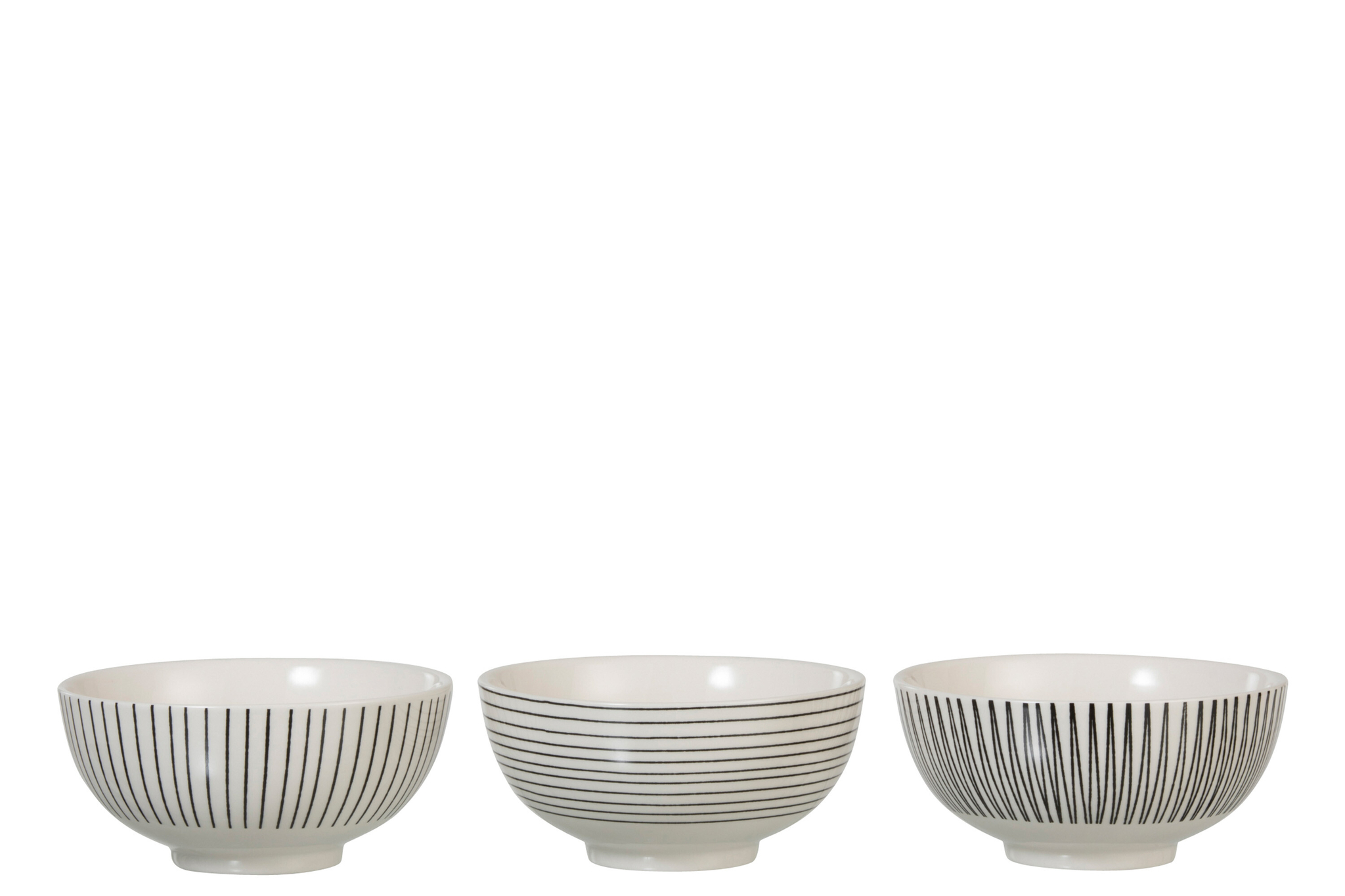 Die 3er Schalen „Stripes“ aus Porzellan besticht durch ihr modernes Weiß-Schwarz-Muster. Mit einem Durchmesser von 14,9 cm, einer Höhe von 7,2 cm und einem Gewicht von 0,38 kg ist sie stabil und gleichzeitig dekorativ. Hergestellt aus 85 % Porzellan und 10 % Glasur, eignet sich die Schale ideal für stilvolles Servieren oder als elegantes Wohnaccessoire. Pflegehinweis: nicht waschbar.