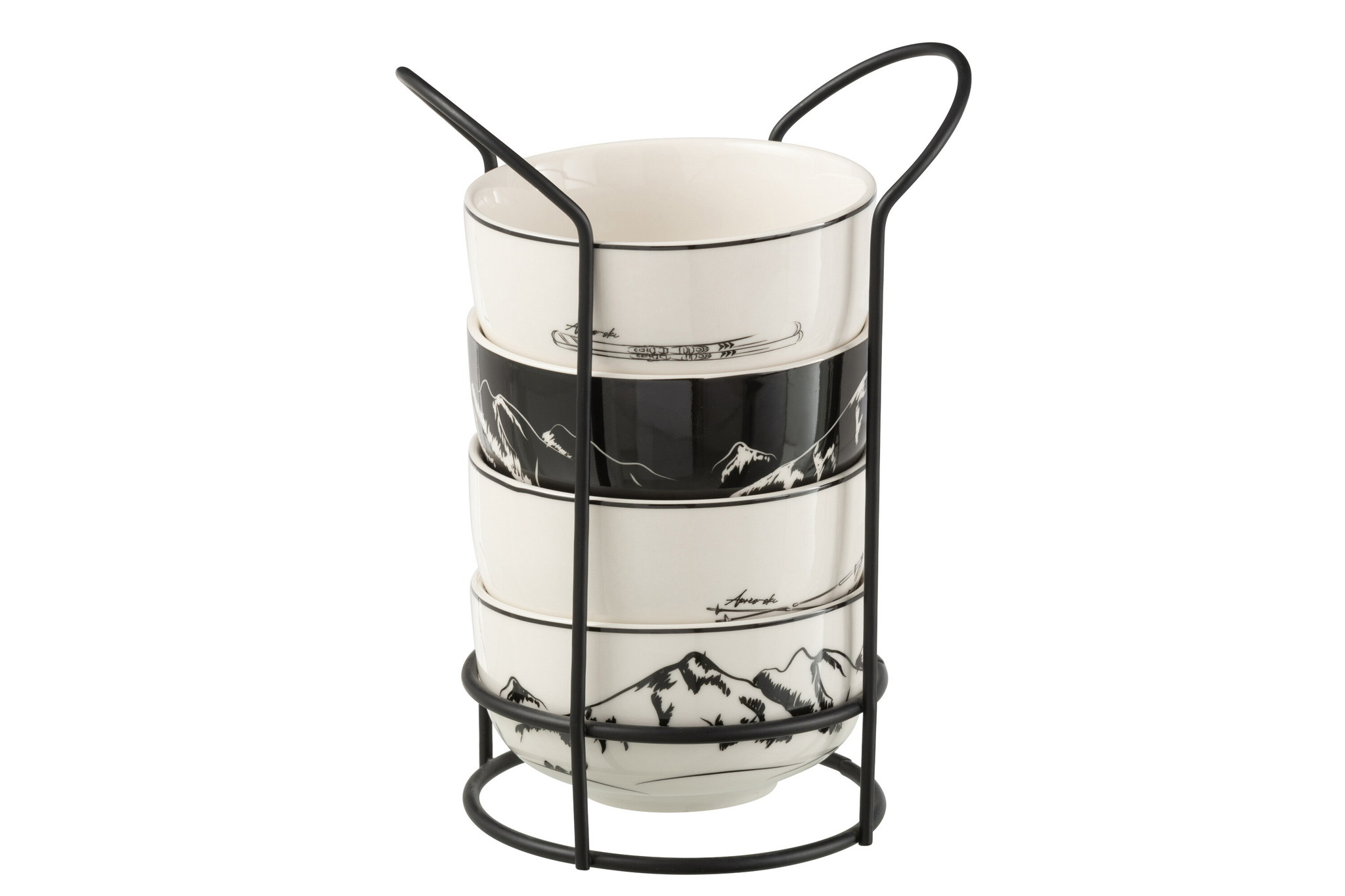 Set aus vier Keramikschalen in Schwarz/Weiß mit Metallgestell, robust, dekorativ und perfekt für stilvolles Servieren.