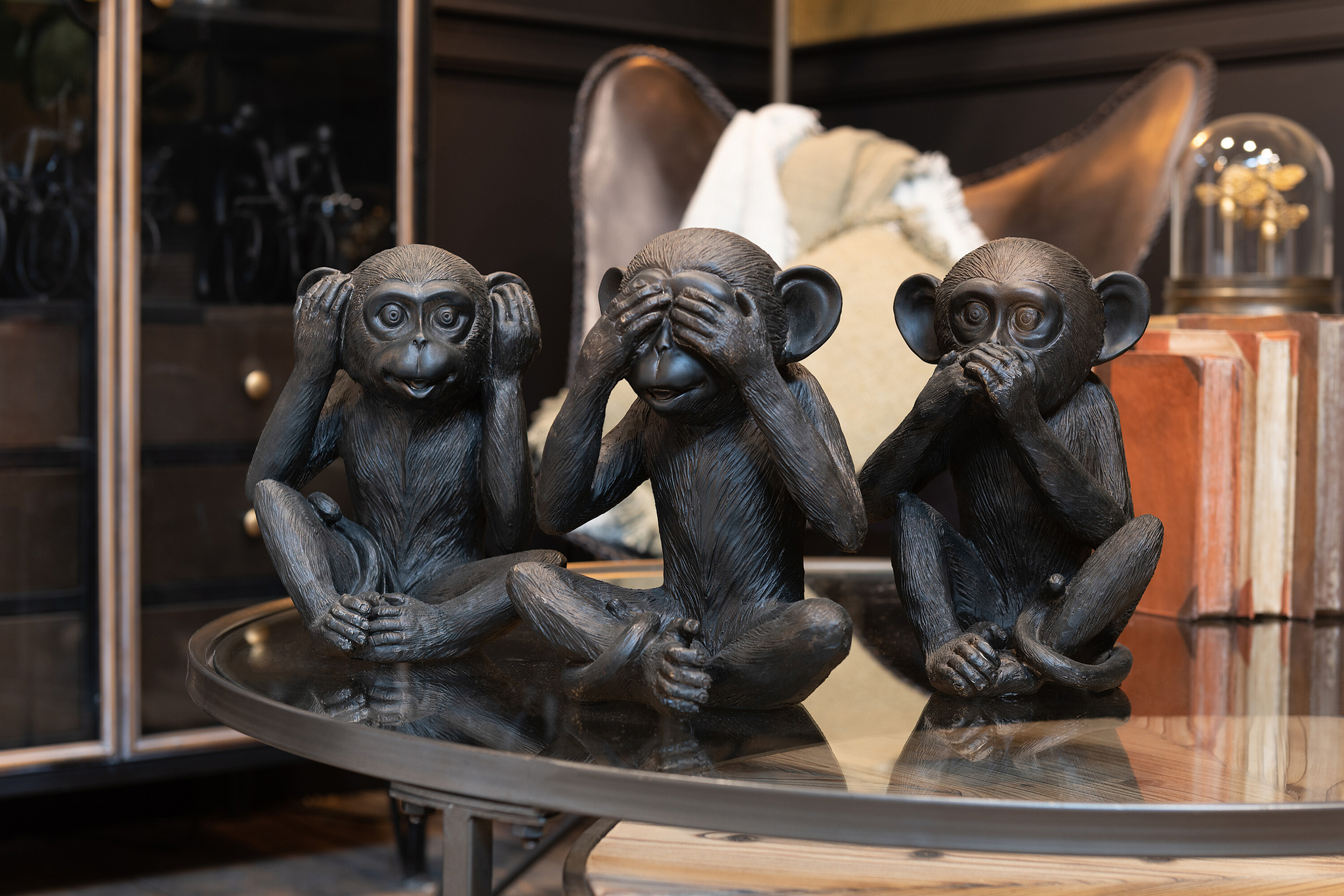 Set aus drei Polyester-Figuren in Braun mit dem Motiv „Nicht sehen, nicht hören, nicht sprechen“. Elegante und dekorative Figuren für stilvolle Wohnräume oder Arbeitsbereiche.