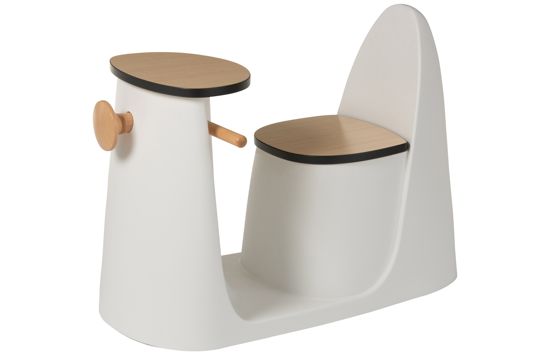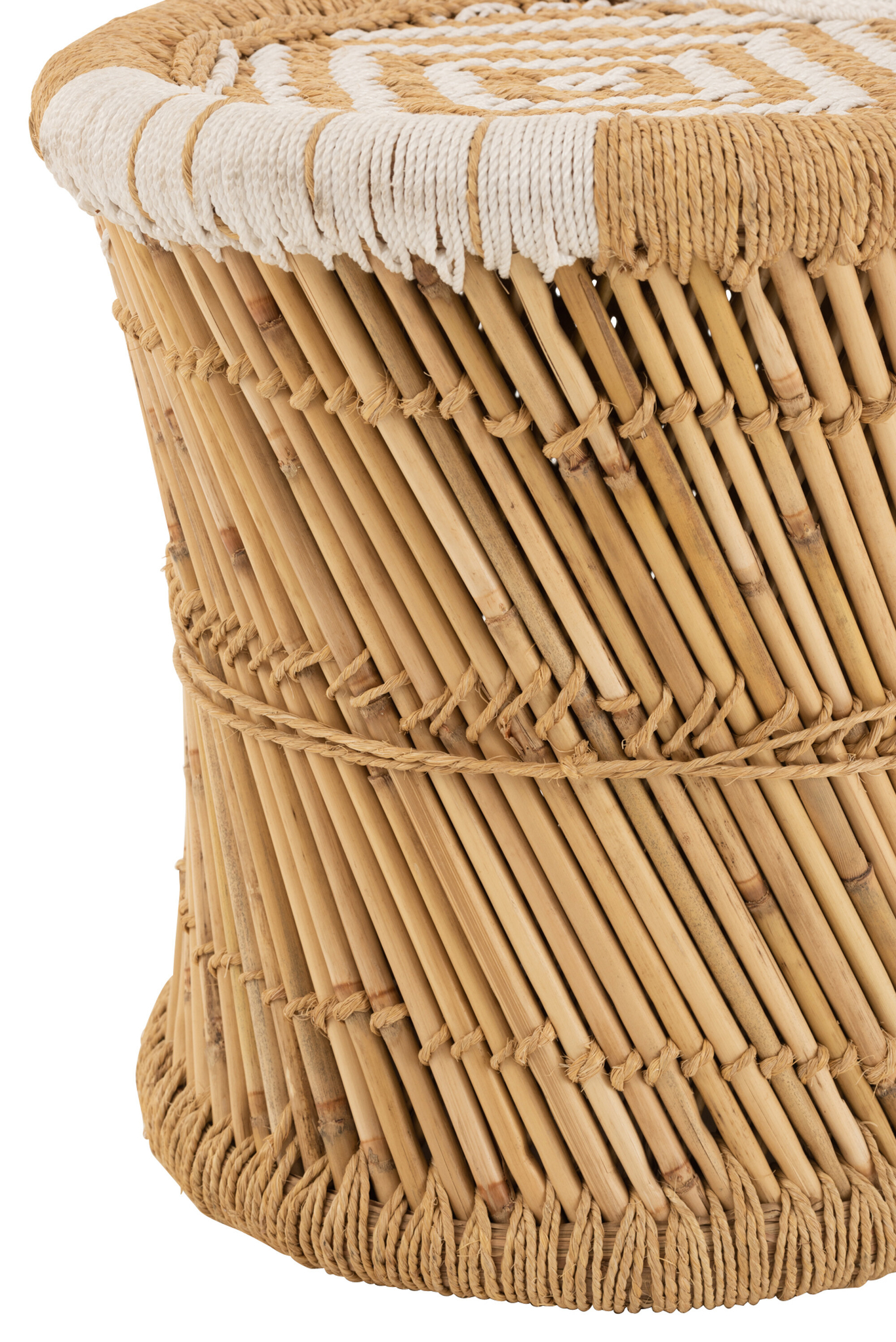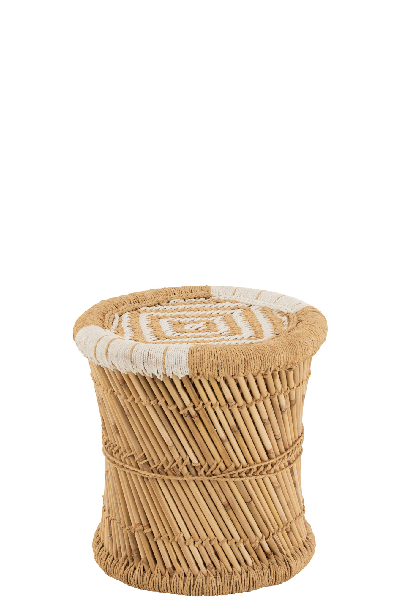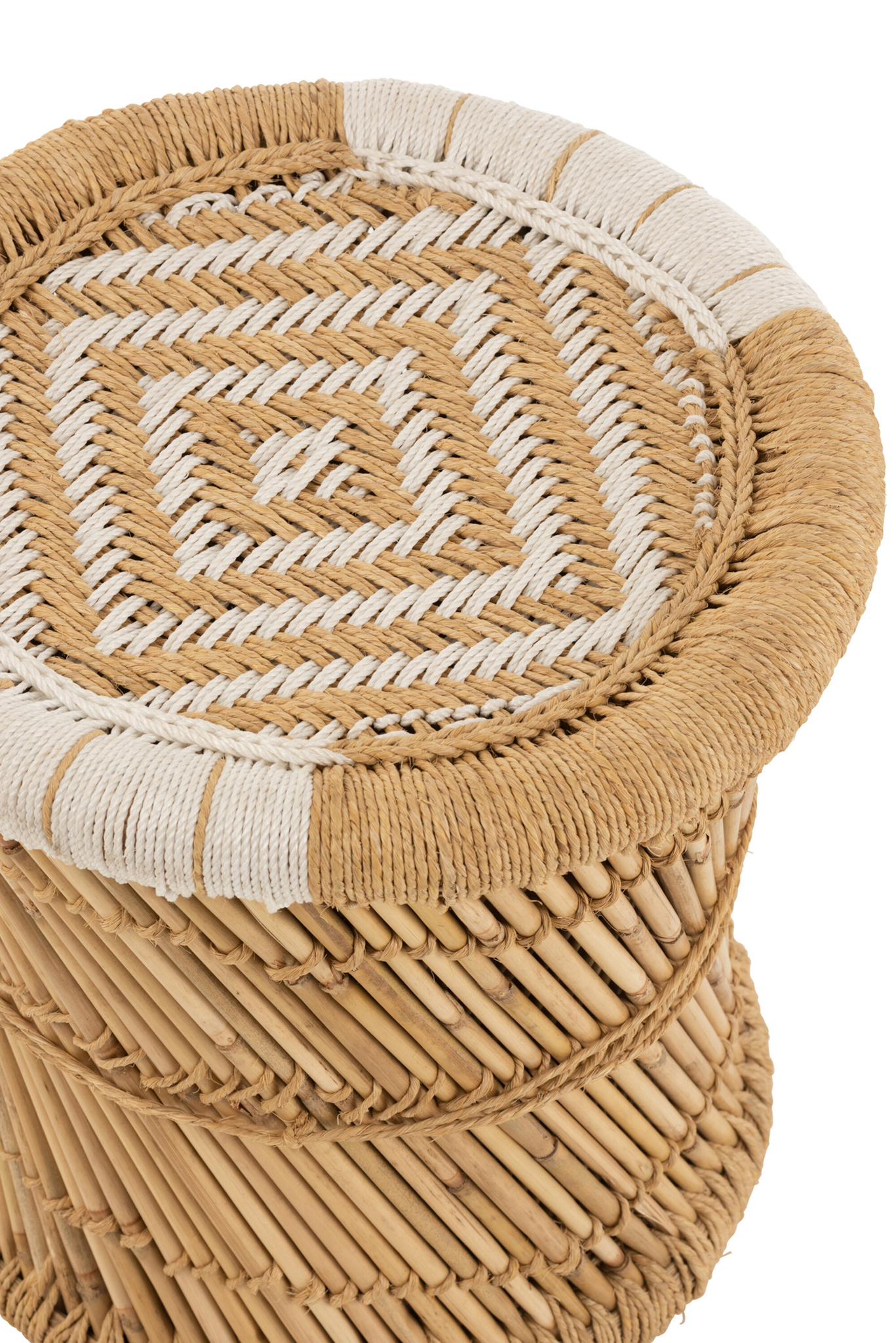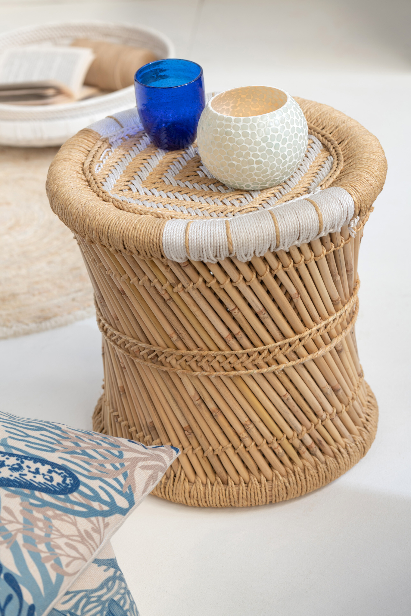 Zeitloser Sitzhocker aus Bambus und Seil in Natur Weiß für flexible Wohnlösungen.