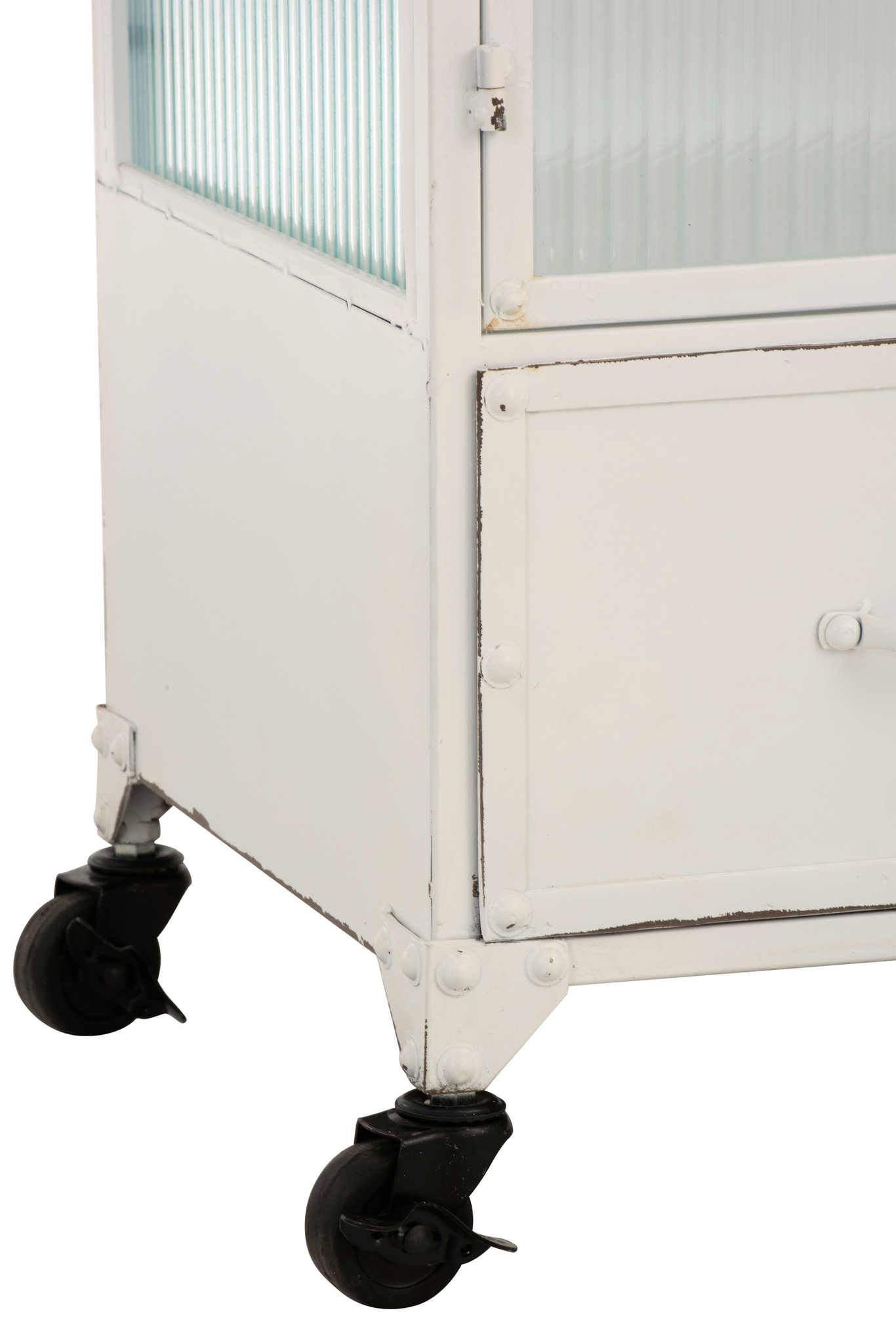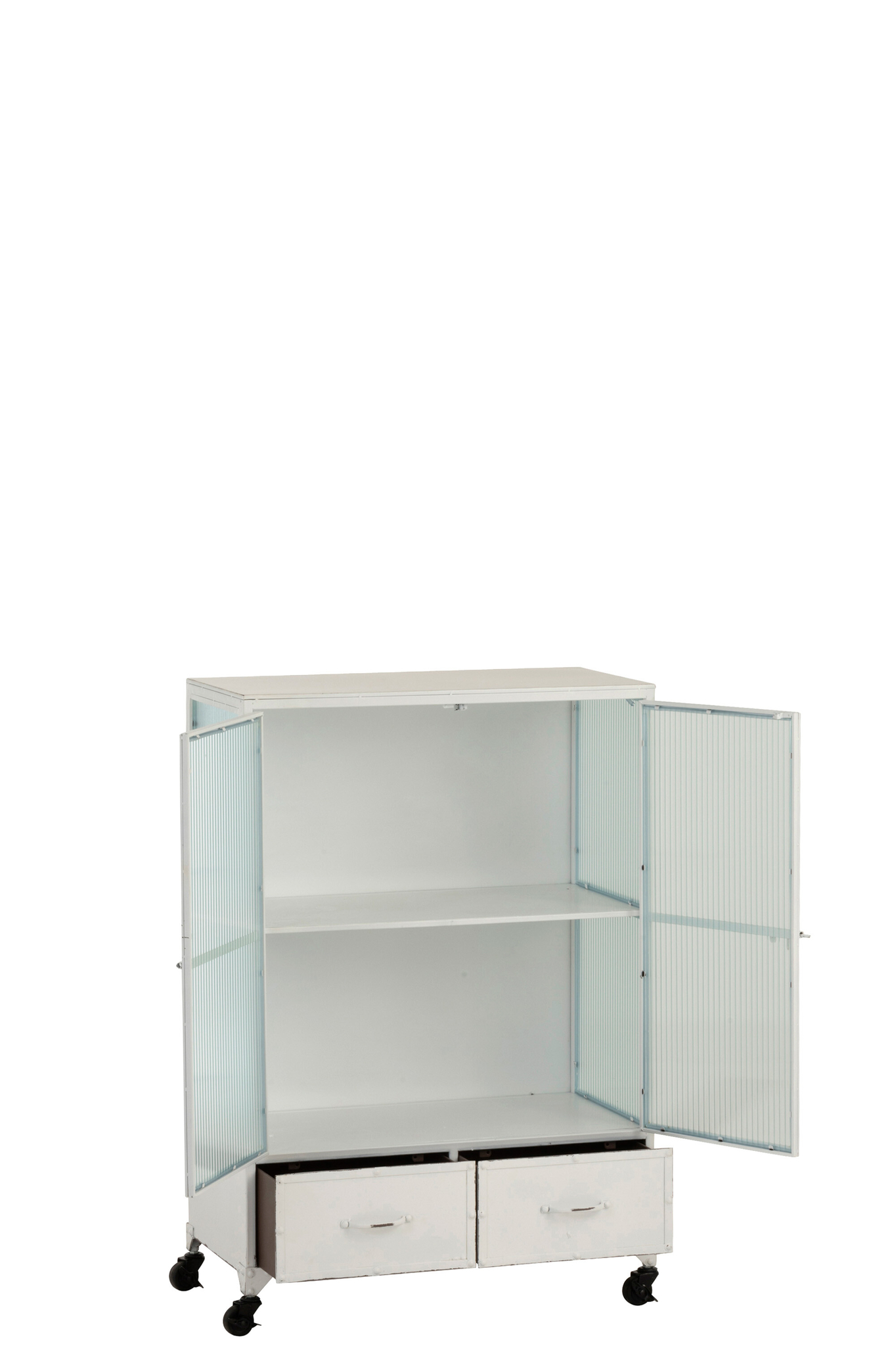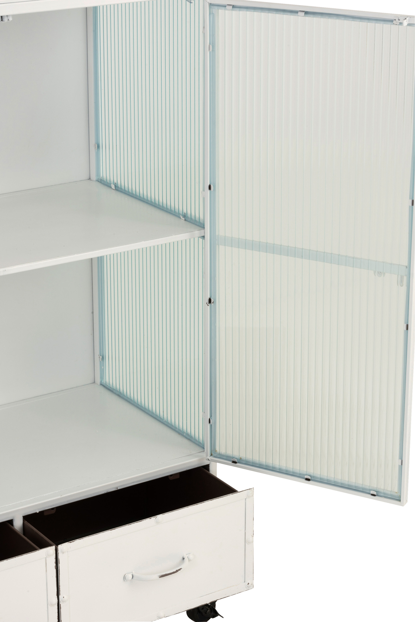 Eleganter weißer Metallschrank mit 3 Türen und 2 Schubladen aus Eisen und Glas.