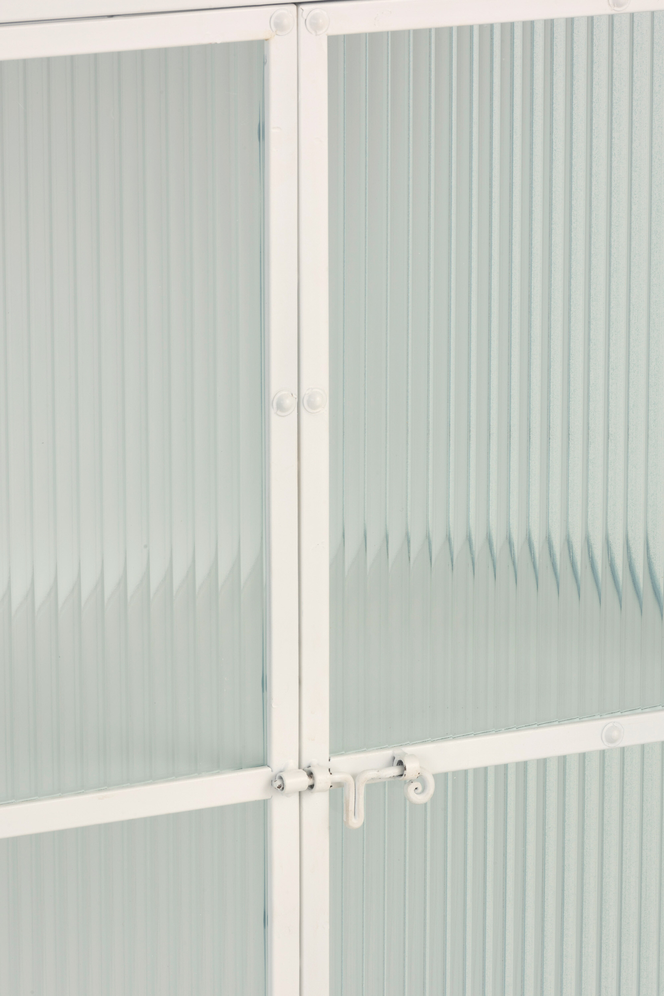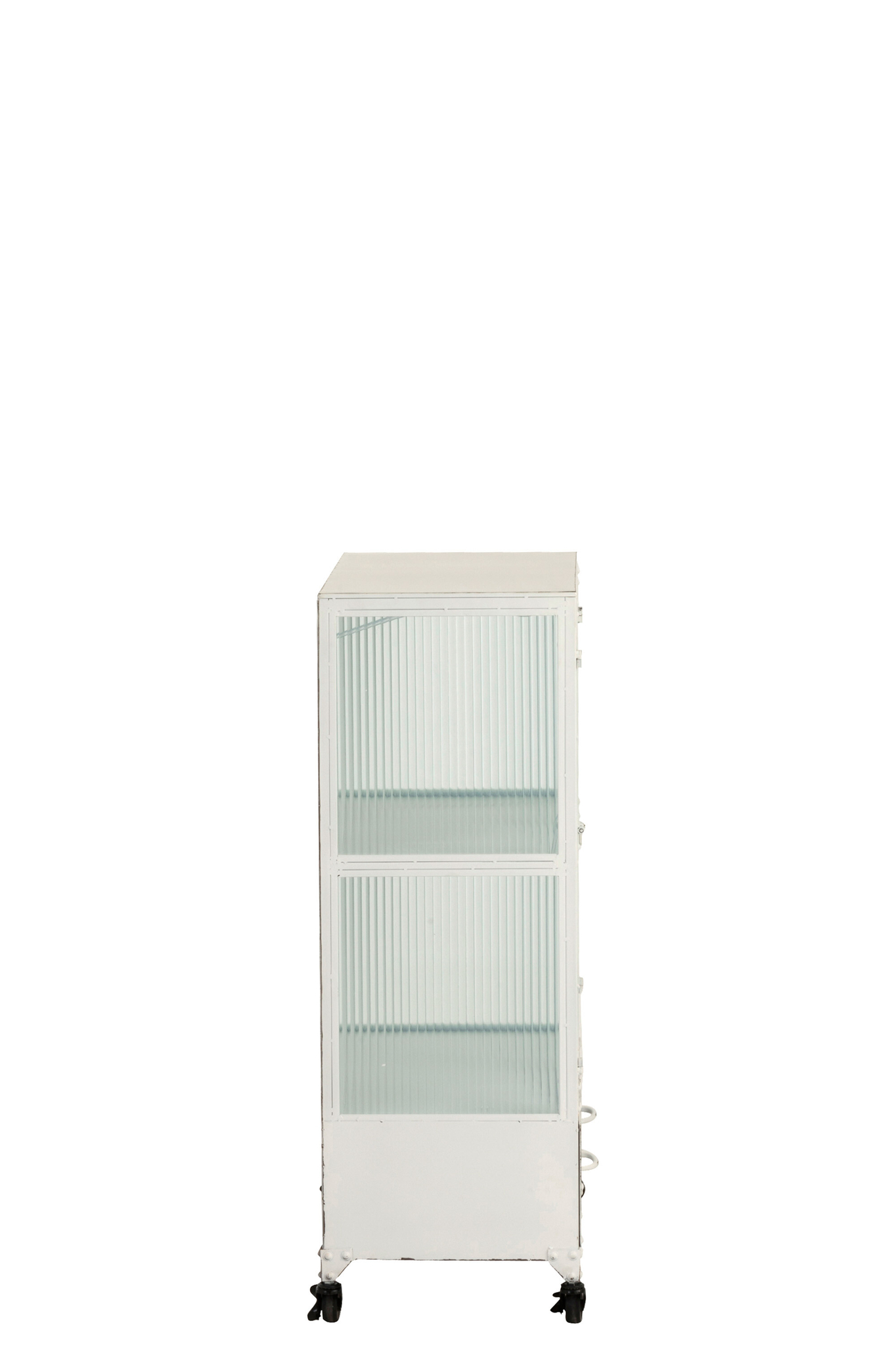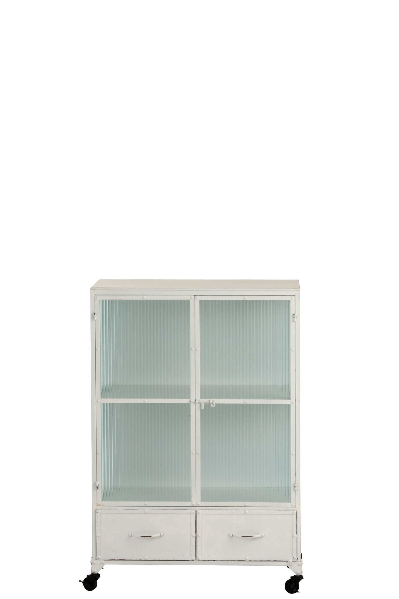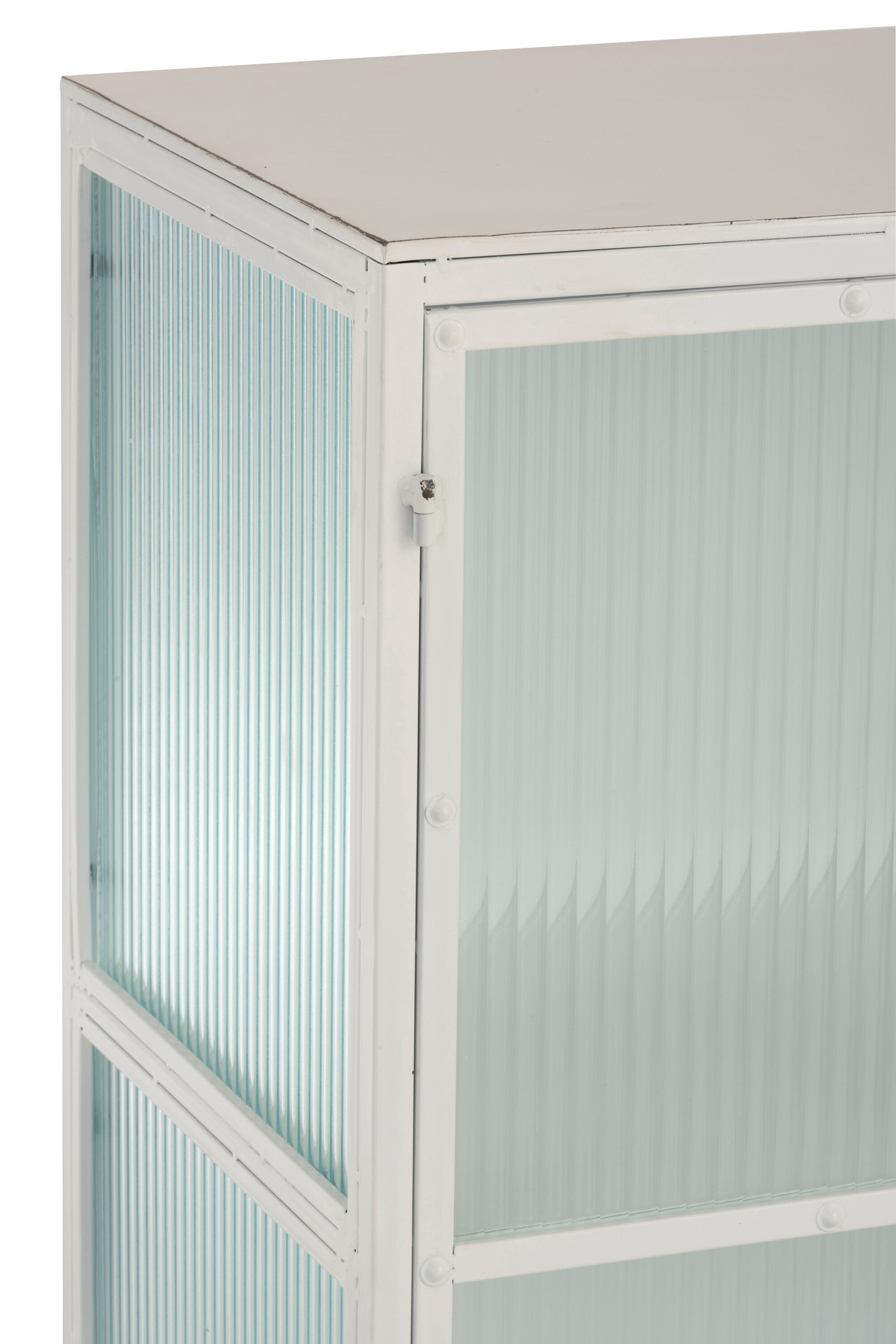 Eleganter weißer Metallschrank mit 3 Türen und 2 Schubladen aus Eisen und Glas.